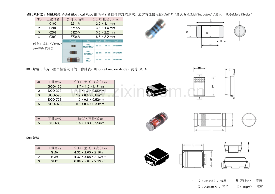 MELF封装:MELF(是Metal Electrical Face的简称) 圆柱体的封装形式,通常有晶圆电阻(Melf-R) /贴式电感(Melf Inductors) /贴式二极管(Melp Diodes ):