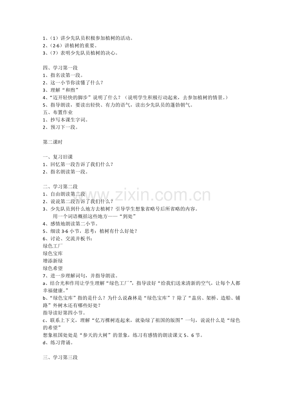 3、理解诗歌内容,了解植树的重要,体会少先队员们要用实际行动绿化祖国的决心,教育学生从小要增强环境保护意识。
