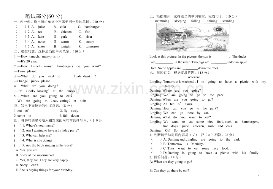 四.将答句的编号填入相对应的问句前的括号内。(10分