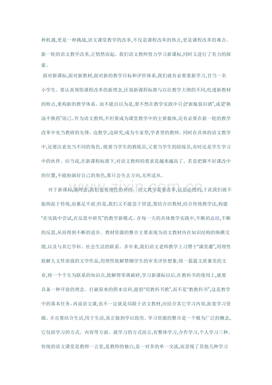 对于新课标,新理念,我们也要理性的对待。语文教学需要改革,这是必然的,于此我们就不能拘泥于传统,而裹足不前;但是,我们又不能急于冒进,要结合旧教材,结合传统教学法,构建“在实践中尝试,在反思中研究”的教学新模式。在每一天的具体教学实践中,不断的总结,不断的反思,从而得到不断的进步。教材资源的整合主要表现为语文教材内在知识结构的纵横交错,以及与其它学科、社会生活的联系。多年来,我们语文老师教学上习惯于“满堂灌”,用理性肢解人文性很强的文学作品,用理性肢解禁锢学生的审美评价想象;将一篇篇文质兼美的文章,将一个个互为联系的知识点,肢解得零离破碎,学习新课标以后,在教科书的使用上,就要具备一种开放的理念。打破原来的照本宣科,提倡“用教科书教”,而不是“教教科书”,这是教学中的基本任务。再说语文课,也不一定就是局限于语文教材,应结合其它学习内容,拓宽学习资源。并且要结合生活,用于生活,真正做到学以致用。学习资源的整合是一个极为广泛的概念,它包括学习的方式、内容等方面。就学习的方式而言,有整体学习,合作学习,个人学习三种。传统的语文课堂是教师一言堂,是教师的独白,是一对多的单一交流,而忽视了其他几种学习方式。语文新课标就是提倡研究性、探讨性、自主性的一种学习方式,主张师生、生生、人机等多种互动的学习方式,使学生在仅有的学习资源中获取最大限度的教学效益。教学资源的整合问题,是一篇大文章。在此,限于篇幅,就不多言了。