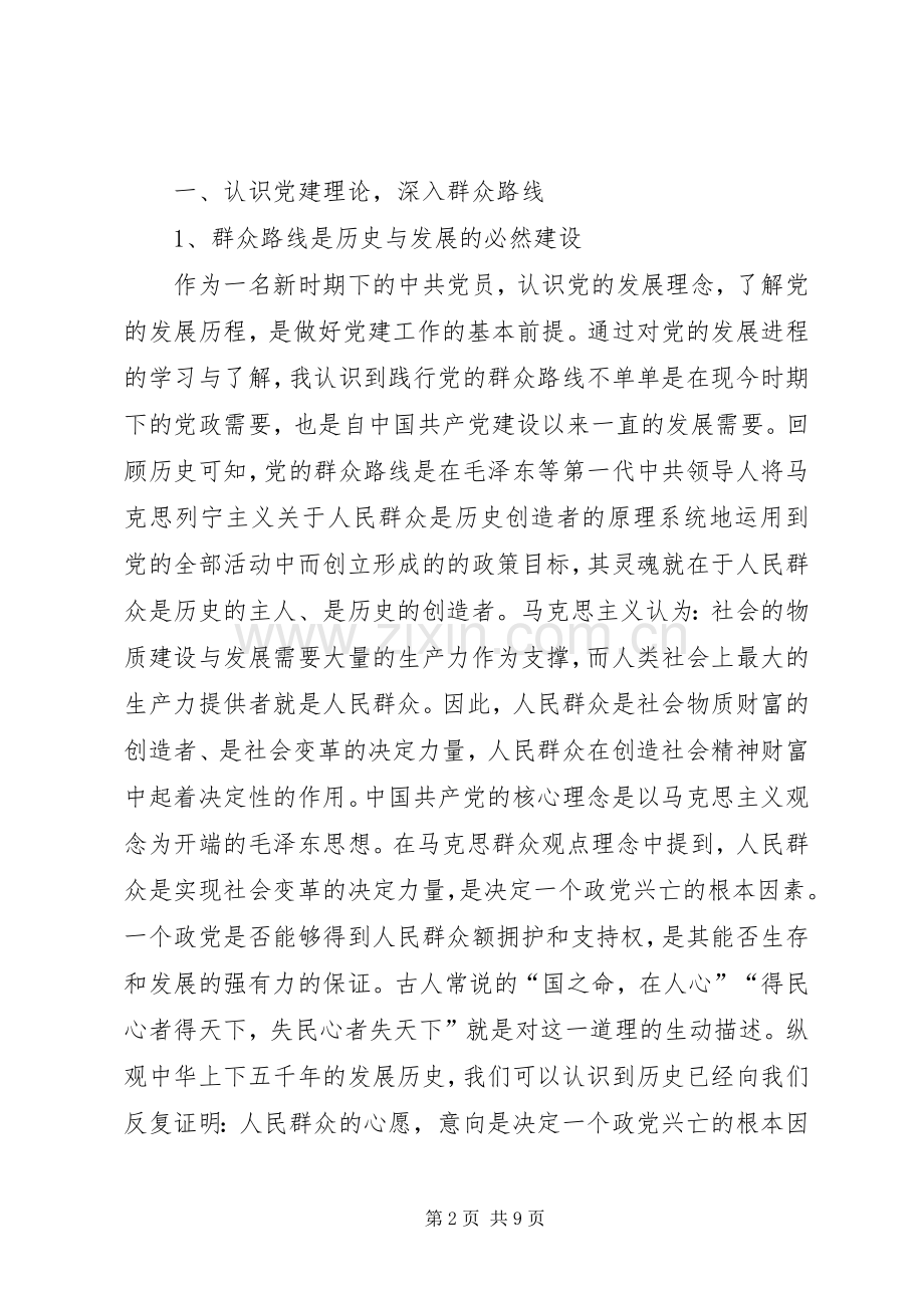 作为一名新时期下的中共党员,认识党的发展理念,了解党的发展历程,是做好党建工作的基本前提。通过对党的发展进程的学习与了解,我认识到践行党的群众路线不单单是在现今时期下的党政需要,也是自中国共产党建设以来一直的发展需要。回顾历史可知,党的群众路线是在毛泽东等第一代中共领导人将马克思列宁主义关于人民群众是历史创造者的原理系统地运用到党的全部活动中而创立形成的的政策目标,其灵魂就在于人民群众是历史的主人、是历史的创造者。马克思主义认为:社会的物质建设与发展需要大量的生产力作为支撑,而人类社会上最大的生产力提供者就是人民群众。因此,人民群众是社会物质财富的创造者、是社会变革的决定力量,人民群众在创造社会精神财富中起着决定性的作用。中国共产党的核心理念是以马克思主义观念为开端的毛泽东思想。在马克思群众观点理念中提到,人民群众是实现社会变革的决定力量,是决定一个政党兴亡的根本因素。一个政党是否能够得到人民群众额拥护和支持权,是其能否生存和发展的强有力的保证。古人常说的“国之命,在人心”“得民心者得天下,失民心者失天下”就是对这一道理的生动描述。纵观中华上下五千年的发展历史,我们可以认识到历史已经向我们反复证明:人民群众的心愿,意向是决定一个政党兴亡的根本因素。在一切社会历史的重大关头,人民群众总是变革的主力,是支持党政与国家发展的核心力量。因此,坚持党的群众路线是现代社会发展与党政建设的基准路线,我们只有坚定党的群众路线不动摇,才能够实现我中华民族的伟大发展目标。