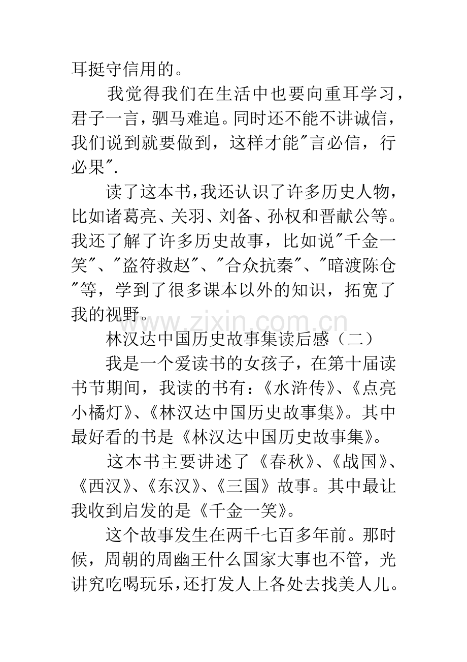 当我看到这本 5 厘米厚、跟字典没多少区别的《林汉达中国历史故事集》时,基本上已经失去了兴趣。但为了完成暑假作业,我被迫翻开了这本"字典",突然发现,这本书并没有我想像的那样乏味,里面的故事非常有趣。一下子,我的劲头上来了。我开始认真读这本书,日日夜夜,每天都读。终于读完了从《春秋故事》、《战国故事》到《东汉故事》、《三国故事》等 120 多个历史故事。其中,我最喜欢的故事是《管鲍之交》。
