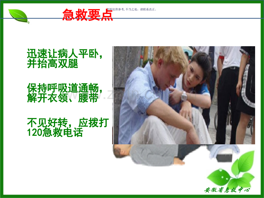 资料仅供参考,不当之处,请联系改正。主主 要要 表表 现现间隔短暂时间(通常为数秒间隔短暂时间(通常为数秒钟)后恢复钟)后恢复可有面色苍白、出汗、脉搏可有面色苍白、出汗、脉搏微弱,血压下降,有时伴有微弱,血压下降,有时伴有抽搐抽搐 突发短暂完全的意识丧失,突发短暂完全的意识丧失,就地摔倒就地摔倒一过性意识障碍一过性意识障碍 主要原因:主要原因:脑供血不足脑供血不足 晕厥晕厥资料仅供参考,不当之处,请联系改正。急救要点急救要点迅速让病人平卧,迅速让病人平卧,并抬高双腿并抬高双腿 保持呼吸道通畅,保持呼吸道通畅,解开衣领、腰带解开衣领、腰带不见好转,应拨打不见好转,应拨打120120急救电话急救电话安徽省急救中心资料仅供参考,不当之处,请联系改正。主要表现主要表现意识丧失,抽搐意识丧失,抽搐两眼上翻、双眼球凝两眼上翻、双眼球凝视、斜视、发直视、斜视、发直口唇青紫伴口吐白沫,口唇青紫伴口吐白沫,可伴有大小便失禁可伴有大小便失禁持续时间不等持续时间不等抽搐停止后意识渐恢抽搐停止后意识渐恢复复安徽省急救中心癫痫癫痫资料仅供参考,不当之处,请联系改正。急救要点急救要点头偏向一侧防止呕吐头偏向一侧防止呕吐物吸入物吸入清除口鼻腔异物,保清除口鼻腔异物,保持呼吸道通畅持呼吸道通畅松解衣领,裤带,动松解衣领,裤带,动作要轻柔,尽量减少作要轻柔,尽量减少刺激刺激用纱布包裹压舌板,用纱布包裹压舌板,筷子,牙刷柄放在上筷子,牙刷柄放在上下磨牙之间,以防舌下磨牙之间,以防舌咬伤,不可强行撬开咬伤,不可强行撬开牙齿牙齿安徽省急救中心资料仅供参考,不当之处,请联系改正。休克休克 shock shock强烈致病强烈致病因素刺激因素刺激有效循环有效循环血量减少血量减少组织缺血组织缺血缺氧缺氧神经神经-体体液因子失液因子失衡衡资料仅供参考,不当之处,请联系改正。分类:分类:1.1.低血容量性:低血容量性:失血性、烧伤性、创伤性失血性、烧伤性、创伤性2.2.血管扩张性:血管扩张性:感染性、过敏性、神经源性感染性、过敏性、神经源性3.3.心源性:心源性:病变、压迫、梗阻病变、压迫、梗阻资料仅供参考,不当之处,请联系改正。症状症状资料仅供参考,不当之处,请联系改正。分期分期早期:早期:神志尚清,焦虑、紧张、皮肤苍白、口唇甲床紫绀、神志尚清,焦虑、紧张、皮肤苍白、口唇甲床紫绀、率快、气促、脉速、血压正常或下降、少尿率快、气促、脉速、血压正常或下降、少尿中期:中期:意识不清、呼吸表浅、心音低钝、脉搏细弱、血压进意识不清、呼吸表浅、心音低钝、脉搏细弱、血压进一步下降、皮肤湿冷发花,少尿或无尿一步下降、皮肤湿冷发花,少尿或无尿晚期:晚期:DICDIC、急性呼衰、急性心衰、急性肾衰、其他、急性呼衰、急性心衰、急性肾衰、其他资料仅供参考,不当之处,请联系改正。资料仅供参考,不当之处,请联系改正。如何处置?如何处置?资料仅供参考,不当之处,请联系改正。急救要点急救要点保持安静、就地抢救保持安静、就地抢救休克卧位:头、脚抬高休克卧位:头、脚抬高保持呼吸道通畅保持呼吸道通畅去除病因(止血、镇痛、保暖)去除病因(止血、镇痛、保暖)建立通道建立通道监测呼吸、脉搏、血压、神志等监测呼吸、脉搏、血压、神志等资料仅供参考,不当之处,请联系改正。脑血管意外脑卒中脑卒中(strokestroke)是脑中风的学名,是一种突然起是脑中风的学名,是一种突然起病的脑血液循环障碍性疾病。又称脑血管意外。病的脑血液循环障碍性疾病。又称脑血管意外。资料仅供参考,不当之处,请联系改正。影响因素资料仅供参考,不当之处,请联系改正。有哪些先兆呢?有哪些先兆呢?资料仅供参考,不当之处,请联系改正。先兆症状先兆症状头晕、头痛、眼发黑一侧肢体麻木、无力反复说话不清楚视物模糊、旋转、耳鸣、呕吐取物不准打哈欠、打嗝等。资料仅供参考,不当之处,请联系改正。一分钟内识别脑卒中一分钟内识别脑卒中抬抬 说说 笑笑 上述任何一项异常,中风的可能性达上述任何一项异常,中风的可能性达72%72%三种都有可能行达三种都有可能行达8585资料仅供参考,不当之处,请联系改正。能做什么能做什么拨打拨打120120电话电话清醒的稳定情绪,稍抬高头部静卧,松衣解带清醒的稳定情绪,稍抬高头部静卧,松衣解带昏迷的头偏向一侧昏迷的头偏向一侧保温或降温保温或降温防止舌咬伤、舌后坠防止舌咬伤、舌后坠限制进水、进食限制进水、进食资料仅供参考,不当之处,请联系改正。预防预防资料仅供参考,不当之处,请联系改正。急性冠脉综合症急性冠脉综合症资料仅供参考,不当之处,请联系改正。心绞痛心绞痛突发胸骨后压榨突发胸骨后压榨性疼痛,性疼痛,舌下含服硝酸甘舌下含服硝酸甘油油 1-5 1-5分钟后分钟后缓解,很少超过缓解,很少超过10-1510-15分钟分钟常见的有常见的有急性心肌梗死急性心肌梗死发作性心前区疼发作性心前区疼痛在痛在1515分钟以上分钟以上口服硝酸甘油不口服硝酸甘油不能缓解症状。能缓解症状。资料仅供参考,不当之处,请联系改正。你怎么啦?你怎么啦?我胸疼,心我胸疼,心慌憋气慌憋气平卧者,平卧者,3030度角半卧位度角半卧位站立者应成坐位站立者应成坐位立即嚼立即嚼160mg-325mg160mg-