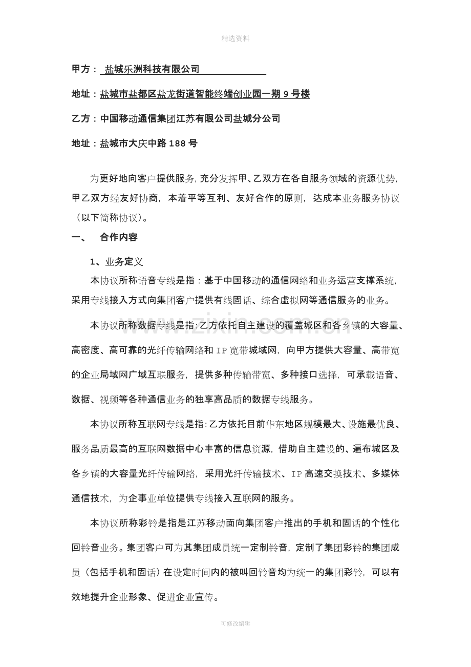 甲方: 盐城乐洲科技有限公司 乙方:中国移动通信集团江苏有限公司盐城分公司