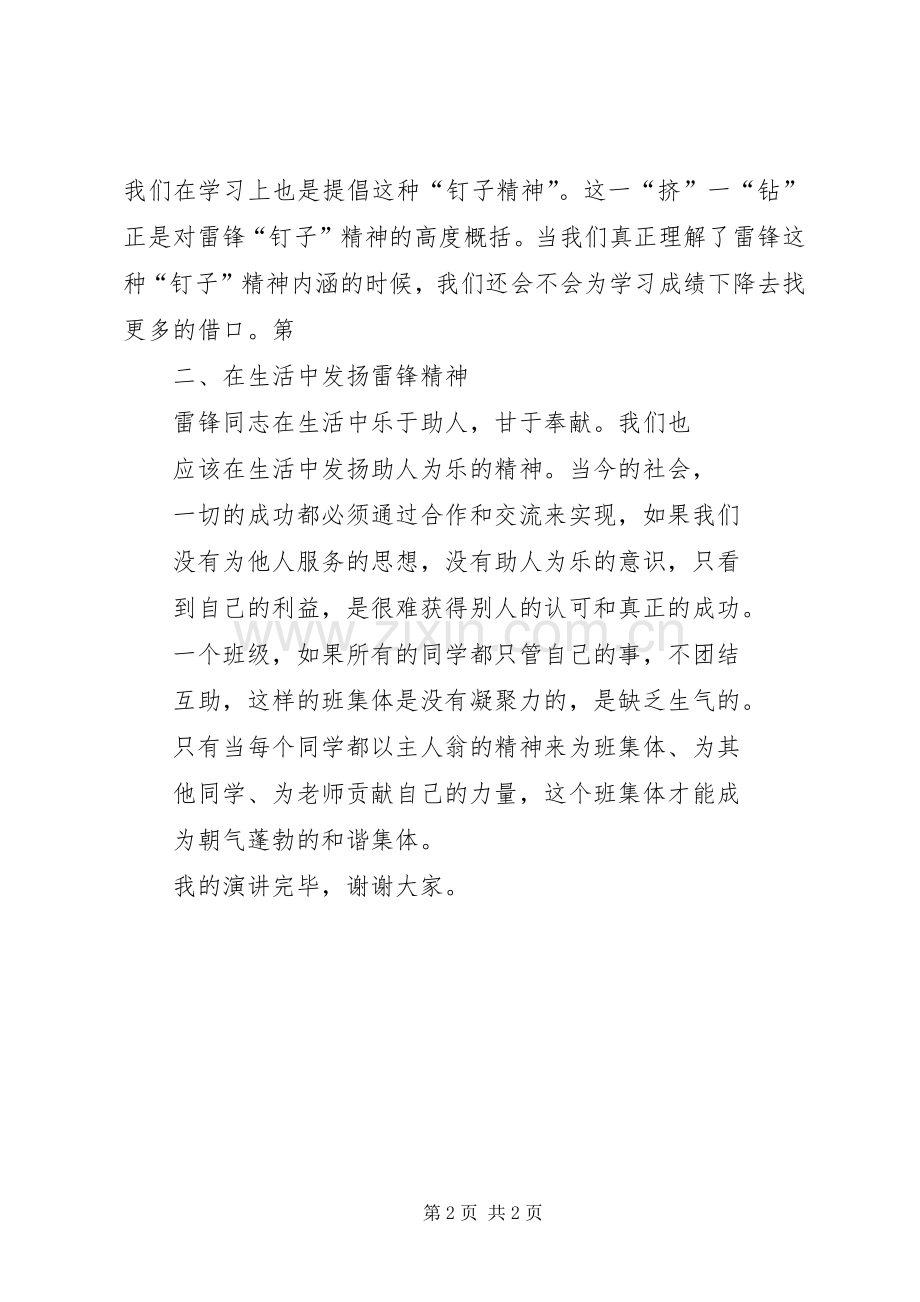 雷锋在学习上很勤奋、扎实。他曾说过:要学习的时间是有的,问题是我们善不善于挤,愿不愿意钻,一块好好的木板上面一个眼也没有,但钉子为什么能钉进去呢。这就是靠压力被挤进去的。由此看来,钉子有两个长处:一个是挤劲,一个是钻劲。我们在学习上也是提倡这种“钉子精神”。这一“挤”一“钻”正是对雷锋“钉子”精神的高度概括。当我们真正理解了雷锋这种“钉子”精神内涵的时候,我们还会不会为学习成绩下降去找更多的借口。第