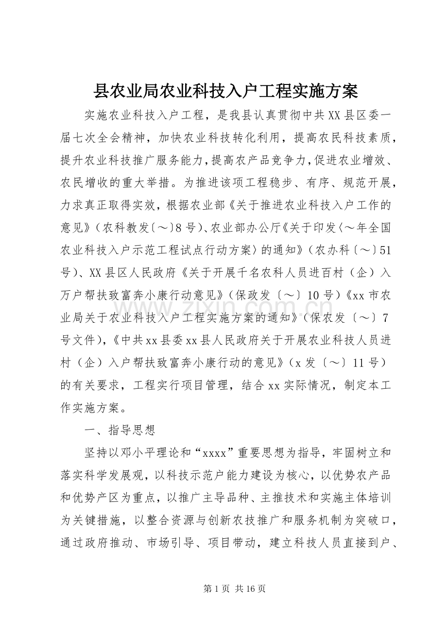 实施农业科技入户工程,是我县认真贯彻中共XX县区委一届七次全会精神,加快农业科技转化利用,提高农民科技素质,提升农业科技推广服务能力,提高农产品竞争力,促进农业增效、农民增收的重大举措。为推进该项工程稳步、有序、规范开展,力求真正取得实效,根据农业部《关于推进农业科技入户工作的意见》(农科教发〔~〕8号)、农业部办公厅《关于印发〈~年全国农业科技入户示范工程试点行动方案〉的通知》(农办科〔~〕51号)、XX县区人民政府《关于开展千名农科人员进百村(企)入万户帮扶致富奔小康行动意见》(保政发〔~〕10号)《xx市农业局关于农业科技入户工程实施方案的通知》(保农发〔~〕7号文件),《中共xx县委xx县人民政府关于开展农业科技人员进村(企)入户帮扶致富奔小康行动的意见》(x发〔~〕11号)的有关要求,工程实行项目管理,结合xx实际情况,制定本工作实施方案。