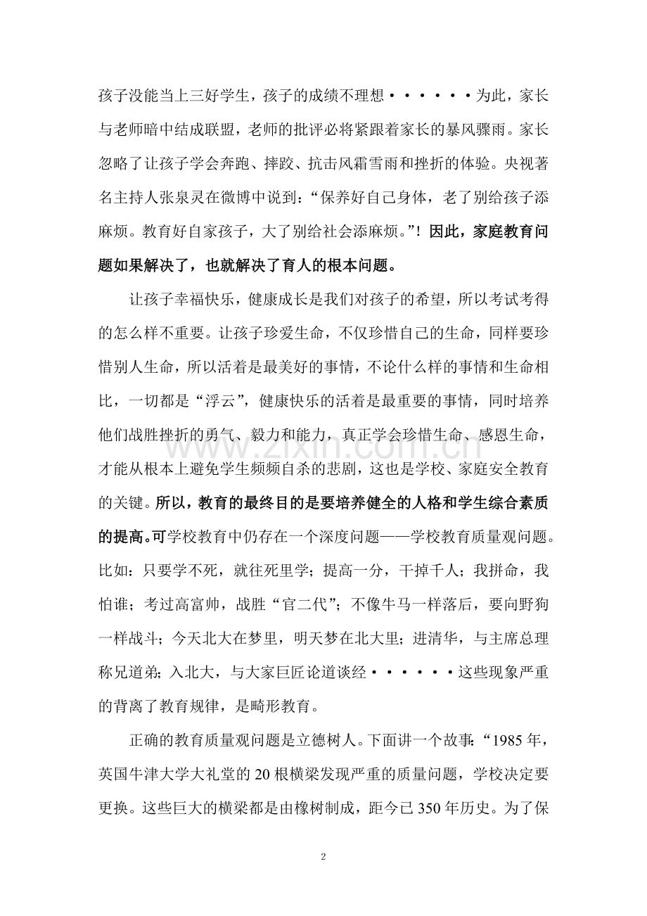 让孩子幸福快乐,健康成长是我们对孩子的希望,所以考试考得的怎么样不重要。让孩子珍爱生命,不仅珍惜自己的生命,同样要珍惜别人生命,所以活着是最美好的事情,不论什么样的事情和生命相比,一切都是“浮云”,健康快乐的活着是最重要的事情,同时培养他们战胜挫折的勇气、毅力和能力,真正学会珍惜生命、感恩生命,才能从根本上避免学生频频自杀的悲剧,这也是学校、家庭安全教育的关键。所以,教育的最终目的是要培养健全的人格和学生综合素质的提高。可学校教育中仍存在一个深度问题——学校教育质量观问题。比如:只要学不死,就往死里学;提高一分,干掉千人;我拼命,我怕谁;考过高富帅,战胜“官二代”;不像牛马一样落后,要向野狗一样战斗;今天北大在梦里,明天梦在北大里;进清华,与主席总理称兄道弟;入北大,与大家巨匠论道谈经······这些现象严重的背离了教育规律,是畸形教育。