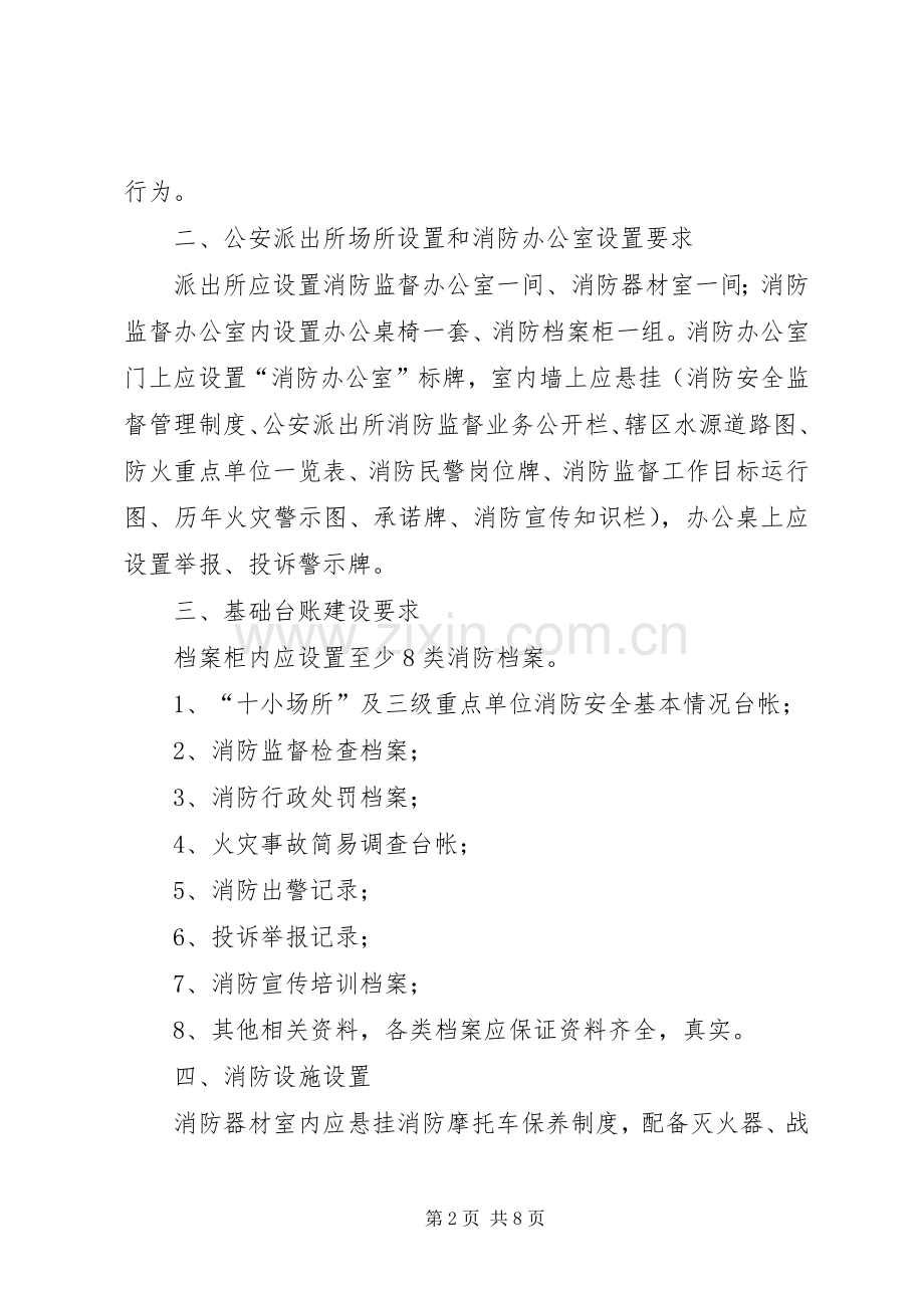 派出所应设置消防监督办公室一间、消防器材室一间;消防监督办公室内设置办公桌椅一套、消防档案柜一组。消防办公室门上应设置“消防办公室”标牌,室内墙上应悬挂(消防安全监督管理制度、公安派出所消防监督业务公开栏、辖区水源道路图、防火重点单位一览表、消防民警岗位牌、消防监督工作目标运行图、历年火灾警示图、承诺牌、消防宣传知识栏),办公桌上应设置举报、投诉警示牌。