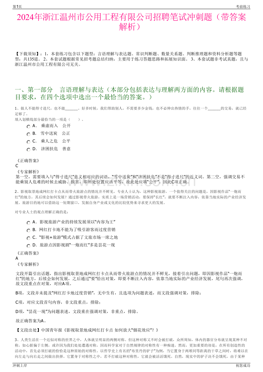 2024年浙江温州市公用工程有限公司招聘笔试冲刺题(带答案解析)【下载须知】:1,本套练习包含以下题型:言语理解与表达题、常识判断题、数量关系题、判断推理题和资料分析题等题型;共135道。2、本套试题根据常见招考题总结归纳,主要用于练习答题思路和拓展知识面。3、本套试题非考试真题,且与浙江温州市公用工程有限公司无关。一、第一部分言语理解与表达(本部分包括表达与理解两方面的内容。请根据题目要求,在四个选项中选出一个最恰当的答案。)1、做人不能得寸进尺,也不能_。好多时候,我们帮助别人,不需要多少金钱,也不必伸出热情的手,往往一个_的交易,就已经足够了。填入划横线部分最恰当的一项是()。A 乘虚而入公开 B 雪中送炭公正 C 乘人之危公平 D 济困扶危善意正确答案C专家解析第一空,需要填入与“得寸进尺”意义相对应的词语,“雪中送炭”和“济困扶危”不是“得寸进尺”的近义词。第二空,强调交易不能乘别人危难的时候去威胁、损害,即所处位置应该平等,故此处应填“公平”。因此C项正确。2、影视取景地成网红打卡点从而带火旅游点的情况并不鲜见。专业人士认为,这种影视旅游,一个值得关注的问题是,因影视作品“一炮而红”的地方,其后续会如何发展?通过影视带火旅游,实质上是一场营销活动,要保持“长红”,就要不断注入内容,依靠当地实际的产业经济发展。旅游目的地可以借助这一短期窗口,发掘自身产业或文化的比较优势来寻求更大的发展。对专业人士的观点理解正确的是:A影视旅游产业的持续发展须以“内容为王”B网红打卡地不能为了吸引游客而过度营销 C“影视+旅游”模式占据了文旅市场一席之地 D旅游点因影视剧“一炮而红”多是昙花一现正确答案A专家解析文段开篇引出话题,指出影视取景地成网红打卡点从而带火旅游点的情况并不鲜见,接着引出问题,即因影视作品“一炮而红”的地方,后续会如何发展,之后通过“要”给出对策,即要不断注入内容,依靠当地实际的产业经济发展,尾句再次强调,故文段重点在对策,对应A项。B项,文段并未提及“网红打卡地过度营销”,无中生有,且选项为问题表述,而文段强调对策,排除;C项,对应文段首句内容,非文段重点,排除;D项,“昙花一现”为问题表述,文段重在强调对策,非重点,排除。故正确答案为A。【文段出处】中国青年报影视取景地成网红打卡点 如何放大“烟花效应”?3、人类生活在一个近似对称的世界之中,人体就呈明显的两侧对称。但这种对称又不时会被打破,众所周知,体内的器官分布就呈现某种不对称,如心脏偏于左侧,或许因为我们处处遭遇对称,因而科学家对于自然规律的对称性有一种痴迷。然而,更加重要的却是,在所有创造性的活动中,首先必须打破的恰恰是这种原始的对称性。以哲学史上有名的“布里丹的驴子”为例,当它置身于两堆同等距离的干草之间时,将难以在向左走与向右走之间做出抉择。它置身于对称性之中,若不打破这种对称性,它就会被活活饿死。自然,现实中的驴子决不会饿死,由于某种第1页考前练习冲刺上岸祝您成功细微差别的影响,它会以不可预测的行动去打破这种逻辑上的对称。对这段文字的主旨概括最准确的是()。A 人类生活在一个近似对称的世界之中使得科学家对于自然规律的对称性有一种痴迷 B 从事创造性活动,必须打破世界的对称性 C 现实的对称不同于逻辑的对称 D 打破原始的对称性是从事创造性活动的首要条件正确答案D专家解析转折后是重点,由“然而,更加重要的却是”可知,“在所有创造性的活动中,首先必须打破的恰恰是这种原始的对称性”是文段的主旨句,之后是举例说明。因此D项正确。4、管理犹如治水,疏堵结合才能 。事实上,“堵”的手段强调严明纪律、形成震慑,操作起来也简单有效,但关键在于是否能够以条令法规为依据进行科学把握。若对待部队建设中带有倾向性、的问题,动辄要求“全部清除”“一律禁止”,甚至“乱打板子”,不仅很难达到目的,还会导致问题累积、矛盾升级。依次填入划横线部分最恰当的一项是:A一劳永逸 紧迫性 B标本兼治 普遍性 C防微杜渐 安全性 D事半功倍 关键性正确答案B专家解析第一空,横线处表达疏堵结合所带来的效果,根据后文“堵的手段强调严明纪律、形成震慑,操作起来也简单有效,但关键在于是否能够以条令法规为依据进行科学把握”可知,疏堵结合才能更好地管理,B项“标本兼治”指对事物的枝节和根本都加以治理,D项“事半功倍”指花费的气力小,收到的成效大,均符合文意,保留。A项“一劳永逸”指辛苦一次,把事情办好,以后就不再费事了,文段并无一次性解决问题之意,排除;C项“防微杜渐”指在错误或坏事萌芽的时候及时制止,不让它发展,文段并无错误或坏事萌芽之意,排除。第二空,横线处搭配“问题”,根据后文“动辄要求全部清除一律禁止”可知,部队建设中存在的问题较多、具有广泛性,B项“普遍性”指存在的面很广泛,具有共同性之意,符合文意,当选。D项“关键性”指事物最关紧要的部分,对事情起决定作用的因素,与文意不符,排除。故正确答案为B。【文段出处】中国军网疏堵结合才能标本兼治5、朱光潜说:“诗人与读诗人常存一种(偏见),以为诗的(精细)奥妙可意会而不可言传,如经科学分析,则如七宝楼台,拆碎不成(片段)。