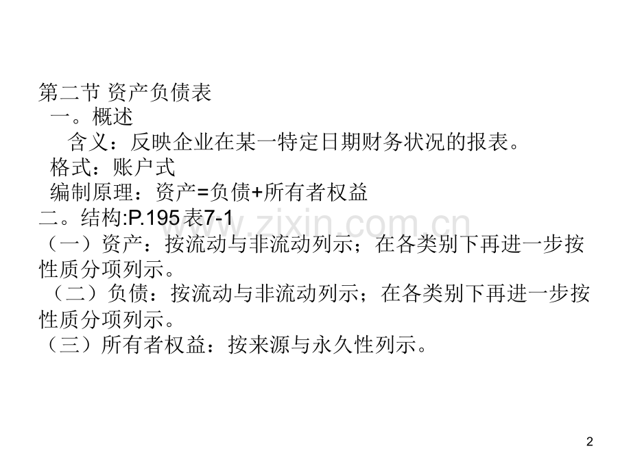 第七章 财务报告第一节 概述 财务报告:企业对外提供的反映某一特定日期的财务状况和某一会计期间的经营成果、现金流量等会计信息的文件。一。构成:报表及其附注两部分。二。财务报表的组成:四表一注 资产负债表、利润表、现金流量表、所有者权益变动表以及附注。相关准则:企业会计准则第30号-财务报表列报 企业会计准则第31号-现金流量表 企业会计准则第32号-中期财务报告 企业会计准则第34号-每股收益1第二节 资产负债表 一。概述 含义:反映企业在某一特定日期财务状况的报表。格式:账户式 编制原理:资产=负债+所有者权益二。结构:P.195表7-1(一)资产:按流动与非流动列示;在各类别下再进一步按性质分项列示。(二)负债:按流动与非流动列示;在各类别下再进一步按性质分项列示。(三)所有者权益:按来源与永久性列示。2二。资产负债表的编制方法 1.数据来源:资产、负债和所有者权益账户的期末余额 2.方法:(1)直接根据总账科目的余额填列;(2)根据有关明细科目的余额计算填列:如往来账;(3)根据总账科目和明细科目的余额分析计算填列:如“长期借款”、“应付债券“、”持有至到期投资“、”长期应付款“等。(4)根据总账科目与其备抵科目抵销后的净额填列。(5)综合运用上述填列方法分析填列。如存货。东奥P.201例3、4、6、7、9、11、15P.217单选第211、P.218多选第27、93第三节 利润表含义:反映企业在一定时期的经营成果的财务报表。编制原理:收入-成本费用=利润格式:分步式资料来源:各损益类科目的发生额东奥P.208例26营业外支出、例27营业成本、例29减值 例30营业利润组成 P.217第12营业收入、第13净利润基本每股收益 例:01年初发行在外的普通股为10000万股,7月1日增发1000万股。年末归属于普通股股东的净利润为5000万元。加权平均数=10 00012/12+1 000 6/12=10 500万股 基本每股收益=5 000/10 500=0.476元/股。4稀释每股收益 企业会计准则第34号每股收益第七条 企业存在稀释潜在普通股的,应当分别调整归属于普通股股东的当期净利润和发行在外普通股的加权平均数,并据以计算稀释每股收益。稀释性潜在普通股,是指假设当期转换为普通股会减少每股收益的潜在普通股。主要包括:可转换公司债券、认股权证和股份期权等。可转换公司债 对于可转换公司债券,计算稀释每股收益时:分子调整项目为可转换公司债券当期已确认费用的利息等的税后影响额;分母的调整项目为假定可转换公司债券当期期初或发行日转换为普通股的股数加权平均数。5 例:某上市公司08.7.1按面值发行年利率3%的可转换公司债券,面值10000万元,期限为5年,利息每年末支付一次,发行结束一年后可以转换股票,转换价格为每股5元,即每100元债券可转换为1元面值的普通股20股。08年该公司归属于普通股股东的净利润为30000万元,08年发行在外的普通股加权平均数为40000万股,债券利息不符合资本化条件,直接计入当期损益,所得税率25%。假设不考虑可转换公司债券在负债成人和权益成份之间的分柝,且债券票面利率等于实际利率。则稀释每股收益为:基本每股收益=30000/40000=0.75假设全部转股,所增加的净利润=100003%(6/12)(1-25%)=112.5假设全部转股,所增加的年加权平均普通股股数=(10000/100)20(6/12)=1000稀释每股收益=(30000+112.5)/(40000+1000)=0.736认股权证和股份期权 计算稀释每股收益时,作为分子的净利润金额一般不变;分母的调整项目:(准则第十条)增加的普通股股数拟行权时转换的普通股股数-行权价格拟行权时转换的普通股股数当期普通股平均市场价格。具体步骤:第一步,假设这些认股权证、股份期权在当期期初(或发行日)已经发行,计算按约定行权价格发行普通股将取得的股款金额;第二步,假设按照当期普通平均市场价格发行股票,计算需发行多少普通股能够带来上述相同的股款金额;第三步,比较行使股份期权、认股权证将发行的普通股股数与按照平均市场价格发行的普通股股数,差额部分相当于无对价发行的普通股,作为发行在外普通股股数的净增加。即可将其视为两部分:一部分是按照平均市场价格发行的普通股,这部分普通股由于是按照市场价发行,导致企业经济资源流入与普通股股数同比例增加,既没有稀释作用也没有反稀释作用,不影响每股收益金额;另一部分是无对价发行的普通股,这部分普通股由于是无对价发行,企业可利用的经济资源没有增加,但发行在外普通股股数增加,因此具有稀释性,应当计入稀释每股收益中。第四步,将净增加的普通股股数乘以其假设发行在外的时间权数,据此调整计算稀释每股收益时的分母数。7例:某公司07年度归属于普通股股东的净利润为500万元,发行在外普通股加权平均数为1250万股,该普通股平均每股市场价格为4元。07年1月1日,该公司对外发行250万份认股权证,行权日为08年3月1日,每份认股权证可以在行权日以3.5元的价格认购本公司1股新发的股份。基本每股收益500/1250=0.4(元)调整增加的普通股股数=250-2503.54=31.25(万股)稀释每股收益=500/(1250+31.25)=0.39(元)其他综合收益:反映企业根据准则规定未在损益中确认的各项利得和损失扣除所得税影响后的余额。综合收益总额=净利润+其他综合收益P.220 多选第11、208第四节 现金流量表引例:一。基本概念 现金流量:指企业现金和现金等价物的流入和流出。1.现金包括:库存现金、银行存款和其他货币资金。*