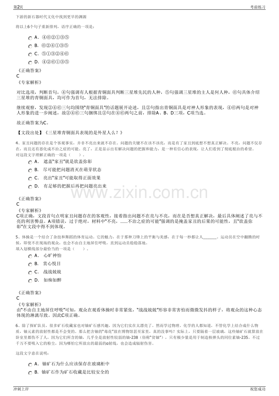2024年中电建生态环境集团有限公司招聘笔试冲刺题(带答案解析)【下载须知】:1,本套练习包含以下题型:言语理解与表达题、常识判断题、数量关系题、判断推理题和资料分析题等题型;共135道。2、本套试题根据常见招考题总结归纳,主要用于练习答题思路和拓展知识面。3、本套试题非考试真题,且与中电建生态环境集团有限公司无关。一、第一部分言语理解与表达(本部分包括表达与理解两方面的内容。请根据题目要求,在四个选项中选出一个最恰当的答案。)1、美国管理学家罗宾斯认为:“管理者是被任命的,他们拥有合法的权力,进行奖励和处罚,其影响力来自于他们所在的职位所赋予的正式权力。领导者可以是任命的,也可以是从一个群体中产生出来的,领导者也可以不运用正式权力来影响他人的活动。”根据这段文字,以下不正确的是()。A 管理者的合法权力是职位赋予的 B 正式任命的领导者就是管理者 C 正式任命的管理者是领导者 D 管理者和领导者是两个不同概念正确答案C专家解析根据题意可知,“领导者”范围上真包含“管理者”。“可以不运用正式权力来影响他人的活动”是“领导者”具有而“管理者”不具有。A项正确,由“来自于他们所在的职位所赋予的正式权力”可知,管理者的合法权利来自于职位赋予的正式权力。C项错误,违背了二者的包含关系。D项正确,管理者和领导者有异同,“两个不同概念”具有片面性。因此答案选C。2、一个人得病最深,莫过于病入膏肓而自以为没病。比如古代的蔡桓公,神医扁鹊几次提醒“不治将恐深”,他先不屑,后不理,再不悦,可当身体毛病_时再想医治,已经_。与其说蔡桓公死于病症,不如说死于讳疾忌医,实乃可叹可悲!填入划横线部分最恰当的一项是()。A 出现无计可施 B 发作无从下手 C 暴露于事无补 D 显露无力回天正确答案D专家解析第一空,所填词语搭配“身体毛病”,且根据前文“不治将恐深”可知,横线处所填词语表达的意思是身体毛病已经十分严重,十分明显。A项,“出现”指产生,文段并非强调身体毛病刚刚产生,而是强调程度的加深,排除;B项,“发作”指起作用,语义尚可,保留;C项,“暴露”指露在外边,无所遮蔽,与“身体毛病”搭配不当,排除;D项,“显露”指明显表露,语义恰当,保留。第二空,根据后文蔡桓公之死可知,横线处表示疾病已经十分严重,无法挽救。B项,“无从下手”指某件事没有任何门径或找不到头绪,也没办法着手去办,强调无头绪,但是却无法体现结果的严重性,排除;D项,“无力回天”比喻局势或病情严重,已无法挽救,语义恰当,当选。3、以“太阳-神鸟-神人-神树”为核心的崇拜,以玉琮、玉牙璋、玉戈、玉璧为核心的玉礼器组合,以及以青铜尊、青铜罍为核心的青铜礼器组合,构成了三星堆文化先民精神信仰的基本内核三星堆祭祀坑中具有神秘色彩的青铜面具,主要是对神人形象的表现这些文化要素,在长江流域和黄河流域都有深厚的根基,它们无论在数量还是在重要性上都更能反映三星堆文化的性质有人根据青铜面具的形象来判断三星堆先民是外星人或欧罗巴人种,则模糊了神话和现实之间的界限三星堆的主人不是什么天外来客,也并非西亚的移民三星堆的青铜面具与同时期盘龙城遗址、新干大洋洲遗址发现的青铜面具一样,都是极夸张且富于地方特色的神人形象,并且可以在长江中第1页考前练习冲刺上岸祝您成功下游的新石器时代文化中找到更早的渊源将以上6个句子重新排列,语序正确的一项是:A B C D正确答案C专家解析对比选项,判断首句,句强调有人根据青铜面具判断三星堆先民的人种,句强调三星堆的主人是何人种,句具体介绍三星堆的青铜面具,均可作为首句,无法排除。继续观察,发现三句均围绕“青铜面具”的话题展开论述,且句指出青铜面具是对神人形象的表现,两句是对神人形象的进一步阐述,故三句捆绑且句在两句之前,排除A、B、D三项,C项当选。故正确答案为C。【文段出处】三星堆青铜面具表现的是外星人么?4、家丑问题的存在是个客观事实,并非不亮出来就不存在。问题的关键不在该不该亮,而是有了家丑到底想不想真正解决。不亮,问题不仅存在,而且还有恶化成不治之症的可能。亮了,正是显示出有解决问题的把握和能力,是一种有信心的表现,让人们看到了彻底根治的希望。对这段文字理解正确的一项是()。A 遮盖“家丑”就是欲盖弥彰 B 尽可能把问题消灭在萌芽状态 C 亮出“家丑”可能取得正面效果 D 有足够的把握后再把问题亮出来正确答案C专家解析C项正确,文段首句点明家丑问题存在的客观性,接着指出问题不在亮与不亮,而在是否想真正解决,最后具体阐述了亮与不亮的利害弊益。A项错误,过于绝对,材料中“不亮,不治之症的可能”强调的是掩盖家丑的后果的可能性,且“欲盖弥彰”在文段中得不到体现。5、体操是一个结合了杂技和舞蹈的体育运动。它的魅力,在于那种刀锋上的平衡与美感,在于每一秒都让人_。运动员在空中翻腾的时候,即使不在现场的观众,也会不由自主地屏住呼吸,直到运动员稳稳落地。填入划横线部分最恰当的一项是()。A 心旷神怡 B 赏心悦目 C 战战兢兢 D 如痴如醉正确答案C专家解析由“不由自主地屏住呼吸”可知,观众在观看体操时非常紧张,“战战兢兢”形容非常害怕而微微发抖的样子,将观众的这种心态体现