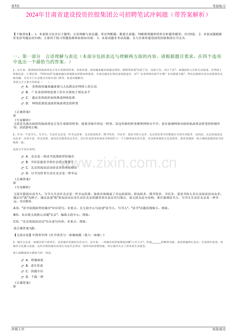 2024年甘肃省建设投资控股集团公司招聘笔试冲刺题(带答案解析)【下载须知】:1,本套练习包含以下题型:言语理解与表达题、常识判断题、数量关系题、判断推理题和资料分析题等题型;共135道。2、本套试题根据常见招考题总结归纳,主要用于练习答题思路和拓展知识面。3、本套试题非考试真题,且与甘肃省建设投资控股集团公司无关。一、第一部分言语理解与表达(本部分包括表达与理解两方面的内容。请根据题目要求,在四个选项中选出一个最恰当的答案。)1、近年来,我国政府的执政理念正发生着新的转变,各级党委、政府越来越多地通过网络、微博等渠道“问需于民、问政于民、问计于民”,疏通政府与百姓互动渠道,在网络上体察民意、汇聚民智。“网络问政”也越来越为普通群众所熟知和接受,并成为通达社情民意的新途径。如“广东省网络问政平台暨广东发展留言板”,网友们能够在此向各级领导反映问题,并有专门人员提交至相关部门领导,促进问题解决。本段文字主要介绍的是()。A 党和政府越来越重视与人民群众在网络上的互动 B 广东省的网络监督工作在全国处于领先水平 C 建议党和政府加快推进网络监督 D 网络监督促进政府执政理念的转变正确答案D专家解析文段首先指出政府的执政理念正发生着新的转变,接着详细介绍这一转变,而这些新的转变都和网络分不开,意在强调网络对政府执政理念转变的积极作用。因此D项正确。2、作为一个读书人、写书人,生活在北京是一件幸运的事。北京的高校多,图书馆多,书店多,爱读书的人也多。北京的实体书店数量在全国名列前茅。也因此,北京的阅读活动众多,内容丰富,形式活泼。阅读活动我参加过多次,还以作家的身份谈读书和创作与一个人精神成长的关系。在这样浓郁的文化氛围里,我常常感到一座古城的面貌因读书而焕然一新。这段文字旨在说明:A北京是一座读书氛围浓厚的城市 B书店是建设书香社会的主要推手 C北京的阅读活动给读者的体验极佳 D以书为伴者生活在北京是一种幸运正确答案D专家解析文段开篇指出读书人、写书人生活在北京是一件幸运的事,接着具体阐述了幸运的原因,即高校多、图书馆多、书店多、爱读书的人多以及阅读活动众多,随后以“我”为例子,通过论述“我”参加活动以及生活在北京的感受再次论证首句观点。故文段为总分结构,重在强调读书人、写书人生活在北京是一种幸运,对应D项。A项,“读书氛围浓厚的城市”对应尾句,非重点,且文段中心句论述“读书人、写书人”,“读书”话题范围缩小,排除;B项,未出现文段核心话题“北京”,偏离文段中心,排除;C项,“北京的阅读活动”为分述句内容,非重点,排除。故正确答案为D。【文段出处】中国青年网在书香里与一座城相拥(我与一座城)3、城市文化是一座城市的气质所在,也是城市发展的内在动力。近年来,一些城市的景观规划动辄“大开大合”,形成 的整体风格,或者移栽网红花木,打造网红街景,将城市文化灌入流量。这些功利的城市治理行为也许会带动一段时间的消费热涨,却让城市失去了原本的生活底色。填入画横线部分最恰当的一项是:A照猫画虎 B老生常谈 C因循守旧 D千篇一律正确答案D第1页考前练习冲刺上岸祝您成功专家解析横线处所填成语搭配“整体风格”,且前文强调“一些城市的景观规划动辄大开大合”,“大开大合”本意为文思跌荡,放得开,收得拢,双引号在文段中表达特殊语义,结合文段主题可知,横线处应体现城市景观规划动作很大,声势很大的意思。在这种情况下,结合尾句中这些做法导致“城市失去了原本的生活底色”可知,城市景观规划虽然看上去搞得很大,但是最终呈现出的风格却失去了城市的特色及其本来的样子。D项“千篇一律”指的是事物只有一种形式,没有变化,符合文意且与“整体风格”搭配恰当,当选。A项“照猫画虎”指的是只从形式上模仿,实际上并不理解,文段未体现出“模仿”之意,排除;B项“老生常谈”指的是人们听惯了的没有新意的话,常搭配观点、话题等,一般不与“整体风格”搭配,排除;C项“因循守旧”指的是守着老样子不改,不求革新,文段未体现出“守旧”之意,排除。故正确答案为D。【文段出处】社会科学报城市改造背后撼不动的是文化认同4、唾液内含有的免疫球蛋白A原本发挥的是抗菌作用,英国拉夫巴勒大学研究人员发觉唾液中这一蛋白的数量与人体免疫力呈正相关。他们花费了三年多时间,对38位参加过美洲杯帆船赛的赛手进行了测试,观察到大约有四分之三的赛手在患上感冒前的两周时,尽管当时感觉良好,但唾液中免疫球蛋白A水平已经急剧下降。英国的研究人员对唾液进行的此项研究,其意义在于()。A 揭示了通过检测唾液内含有的免疫球蛋白A数量,人们可以判断自身的免疫力状况,在免疫力低下时及时采纳措施,以防疾病袭扰 B 明确了唾液中免疫球蛋白A的数量越高,则人体免疫力越强,这是因为免疫球蛋白A在发挥作用 C 发现了感冒的潜伏期为两周,在此期间,唾液中免疫球蛋白A水平已经急剧下降,而人们不会有免疫力下降的感觉 D 颠覆了人们对唾液内含有的免疫球蛋白A的抗菌作用的认识正确答案A专家解析文段首先指出唾液中的免疫球蛋白A数量与人体免疫力呈正相关,接下来通过测试结果对这一主旨进行解释。“以防疾病袭扰