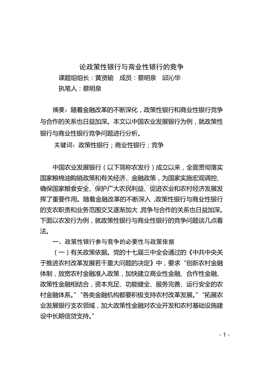 中国农业发展银行(以下简称农发行)成立以来,全面贯彻落实国家粮棉油购销政策和有关经济、金融政策,为国家实施宏观调控、确保国家粮食安全、保护广大农民利益、促进农业和农村经济发展发挥了重要作用。随着金融改革的不断深入 ,政策性银行与商业性银行的支农职责和业务范围交叉逐渐加大,竞争与合作的关系也日益加深。下面以农发行为例,就政策性银行与商业性银行的竞争问题谈几点看法。