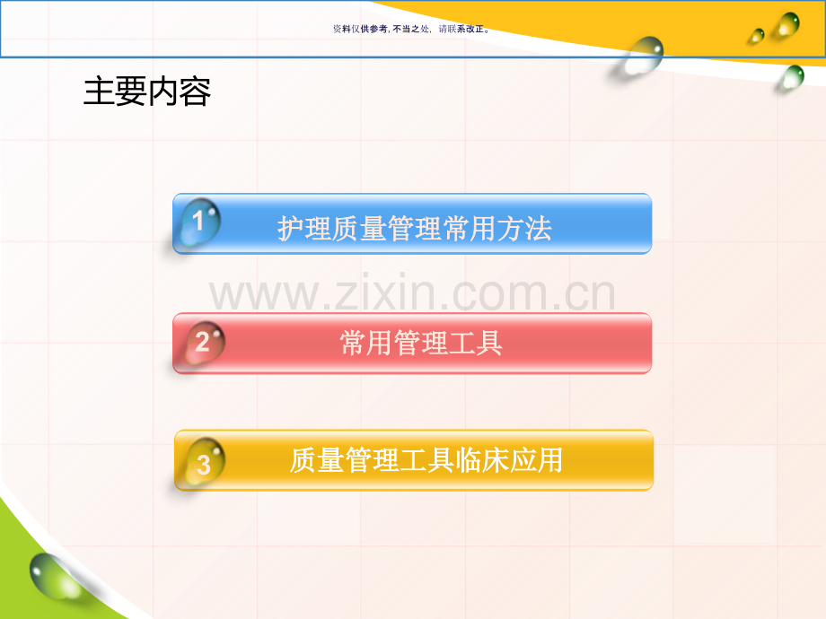资料仅供参考,不当之处,请联系改正。标准制定依据标准制定依据新标准特点新标准特点检查方法检查方法汇报汇报提纲提纲 标准解读标准解读质量追踪内容质量追踪内容结果呈现及反馈形式结果呈现及反馈形式护理质量指标计算护理质量指标计算资料仅供参考,不当之处,请联系改正。主要内容护理质量管理常用方法护理质量管理常用方法 常用管理工具常用管理工具 质量管理工具临床应用质量管理工具临床应用123资料仅供参考,不当之处,请联系改正。护理质量管理常用方法护理质量管理常用方法追踪方法学追踪方法学追踪方法学追踪方法学根本原因分析法根本原因分析法根本原因分析法根本原因分析法失效模式失效模式失效模式失效模式品管圈品管圈品管圈品管圈六西格六西格六西格六西格玛玛管理管理管理管理五常法五常法五常法五常法PDCAPDCAPDCAPDCA循环循环循环循环效应分析效应分析效应分析效应分析资料仅供参考,不当之处,请联系改正。一、PDCA循环解决问题是需要方法的,否则必将杂乱无章,思路混乱。一般问题的解决都需要一定的工作程序和方法。PDCA循环是有效进行任何一项工作的合乎逻辑的工作程序。是护理质量管理最基本的方法之一,在质量管理中它得到了广泛的应用,并取得了很好的效果资料仅供参考,不当之处,请联系改正。PDCA循环简约介绍 PDCA循环PDCA循环又叫质量环,是管理学中的一个通用模型,最早由休哈特(Walter A.Shewhart)于1930年构想,后来被美国质量管理专家戴明(Edwards Deming)博士在1950年再度挖掘出来,并加以广泛宣传和运用于持续改善产品质量的过程中。它是全面质量管理所应遵循的科学程序。全面质量管理活动的全部过程,就是质量计划的制订和组织实现的过程,这个过程就是按照PDCA循环,不停顿地周而复始地运转的。资料仅供参考,不当之处,请联系改正。PDCA循环的四个阶段八个步骤阶段步骤主要方法P1、分析现状,找出问题排列图、直方图、控制图2、分析各种影响因素或原因因果图3、找出主要影响因素排列图、相关图4、针对主要原因,制定措施计划回答5W1H为什么制定该措施(why)达到什么目标(what)在何处执行(where)由谁负责完成(who)什么时间完成(when)如何完成(how)D5、执行、实施计划C6、检查计划执行结果排列图、直方图、控制图A7、总结成功经验、制定标准制定或修改工作规程、检查规程或其他有关规章制度8、把未解决的或新出现问题转入下一个循环资料仅供参考,不当之处,请联系改正。处理阶段是PDCA循环的关键。因为处理阶段就是解决存在问题,总结经验和吸取教训的阶段。该阶段的重点又在于修订标准,包括技术标准和管理制度。没有标准化和制度化,就不可能使PDCA循环转动向前。PDCA循环,可以使我们的思想方法和工作步骤更加条理化、系统化、图像化和科学化。它具有如下特点:(1)大环套小环,小环保大环,推动大循环 PDCA循环作为质量管理的基本方法,各级部门根据组织的方针目标,都有自己的PDCA循环,层层循环,形成大环套小环,小环里面又套更小的环。大环是小环的母体和依据,小环是大环的分解和保证。各级部门的小环都围绕着组织的总目标朝着同一方向转动。通过循环把组织上下的各项工作有机地联系起来,彼此协同,互相促进。PDCA循环特点循环特点资料仅供参考,不当之处,请联系改正。(2)不断前进、不断提高 PDCA循环就像爬楼梯一样,一个循环运转结束,质量就会提高一步,然后再制定下一个循环,再运转、再提高,不断前进,不断提高。(3)门路式上升。PDCA循环不是在同一水平上循环,每循环一次,就解决一部分题目,取得一部分成果,工作就前进一步,水平就进步一步。每通过一次PDCA循环,都要进行总结,提出新目标,再进行第二次PDCA循环,使品质治理的车轮滚滚向前。PDCA每循环一次,品质水平和治理水平均匀进一步。(4)在运行过程中充分体现三全,即全面、全员、全程的质量管理。PDCA循环特点循环特点资料仅供参考,不当之处,请联系改正。PDCAPDCAPDCAPDCA循环示例循环示例循环示例循环示例资料仅供参考,不当之处,请联系改正。追踪方法学介绍追踪追踪方方法法学学(TracerTrace Mrthodlogy,TM)是一种过程管理的方法学-2004年始于JCAHO2010年卫生部医管司启动追踪方法学课题组进行专项理论研究与试点评估以“患者为中心”的理念,用患者的视角,实际了解医院的服务品质评价者追踪医院患者的治疗、护理、服务经历,或者考察医院的治疗、护理、服务系统,评估医疗机构对患者安全和质量操作标准的遵从性资料仅供参考,不当之处,请联系改正。个案追踪个案追踪(追踪医疗服务提供过程)资料仅供参考,不当之处,请联系改正。患者个案追踪地图2.急诊室:分诊入院与再住院给药程序,尤其高风险药物1.最新的病人状态用药程序更改处方营养、跌倒、皮肤、疼痛评估与控制病人卫教出院准备康复能力训练3.放射影像部门患者身份核实患者状况及危象5.ICU各单位之沟通入住评估再入住评估用药安全变更处方治疗程序重要设备维护与警示病危告知、同意卫教、感控6.药房高风险药物,整个配药程序卫教、患者参与回收药物药物不良反应报告用药评估指导用药咨询TPN无菌操作7.物理及其它治疗室交接程序治疗评估、再评估目标、设定-短、中长病人目标疼痛评估与相关文件出院准备、训练患者信息聚焦范围症