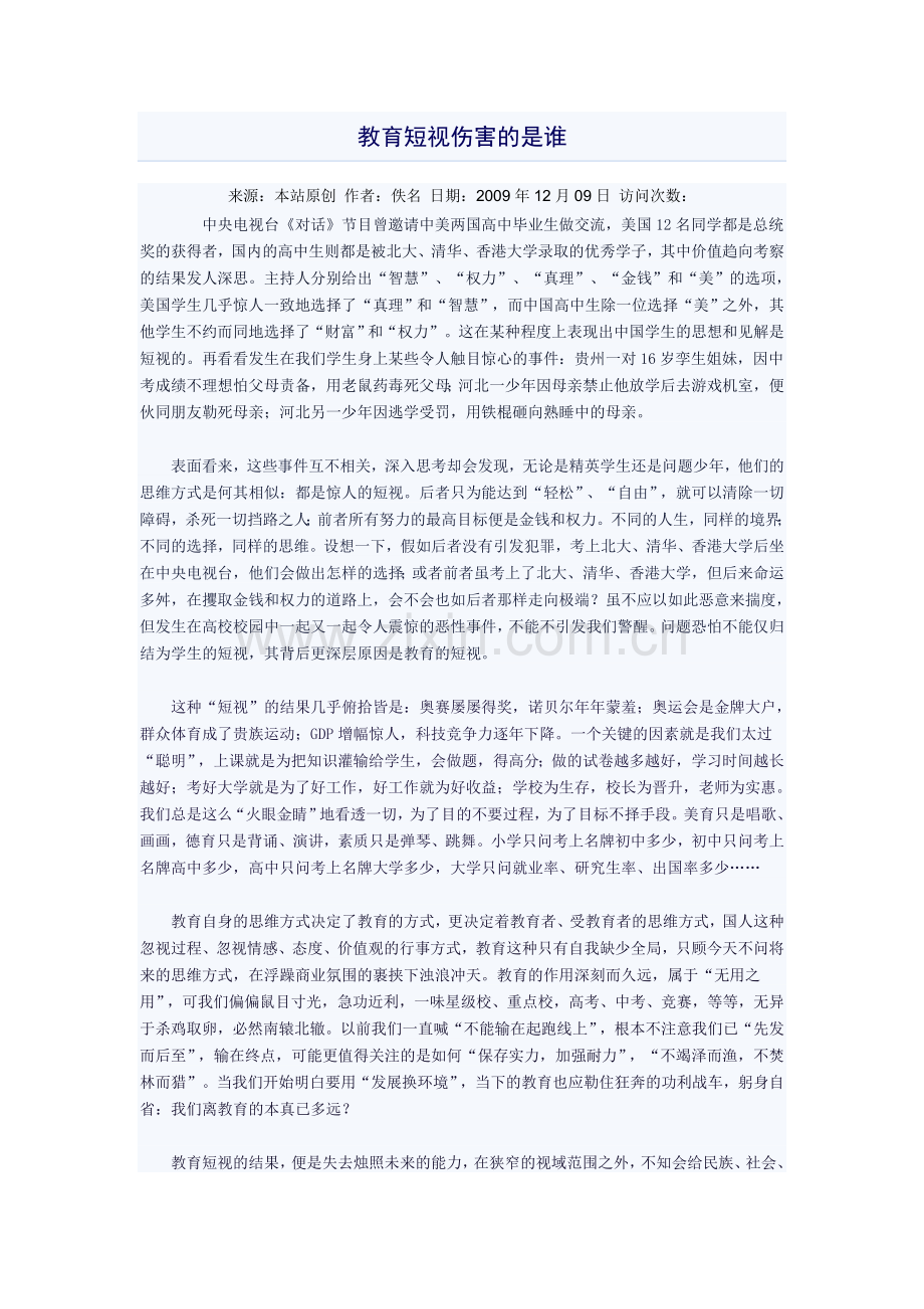 中央电视台《对话》节目曾邀请中美两国高中毕业生做交流,美国12名同学都是总统奖的获得者,国内的高中生则都是被北大、清华、香港大学录取的优秀学子,其中价值趋向考察的结果发人深思。主持人分别给出“智慧”、“权力”、“真理”、“金钱”和“美”的选项,美国学生几乎惊人一致地选择了“真理”和“智慧”,而中国高中生除一位选择“美”之外,其他学生不约而同地选择了“财富”和“权力”。这在某种程度上表现出中国学生的思想和见解是短视的。再看看发生在我们学生身上某些令人触目惊心的事件:贵州一对16岁孪生姐妹,因中考成绩不理想怕父母责备,用老鼠药毒死父母;河北一少年因母亲禁止他放学后去游戏机室,便伙同朋友勒死母亲;河北另一少年因逃学受罚,用铁棍砸向熟睡中的母亲。