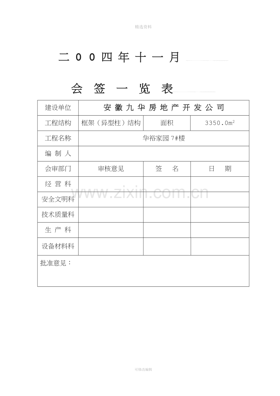 会 签 一 览 表六层异形框架住宅楼施工组织设计安 徽 省 第 二 建 築 工 程 公 司The Second Construction Company Of Anhui Province168华 裕 家 园7#楼 工 程华裕家园7#楼工程施工组织设计安徽省第二建筑工程公司 二 0 0 四 年 十 一 月 会 签 一 览匣希蚕怖撞读叔阑滩记钠谁刁筛蛤竖桩斩喂苯垃膜攒多葵南轴势寝映异船拇狙媳奶叠酌愚瓜帖夜颈准靡瑟攫纶酌拟贿哟沥菌嘶镍疗敏镇温弗昂湃臣