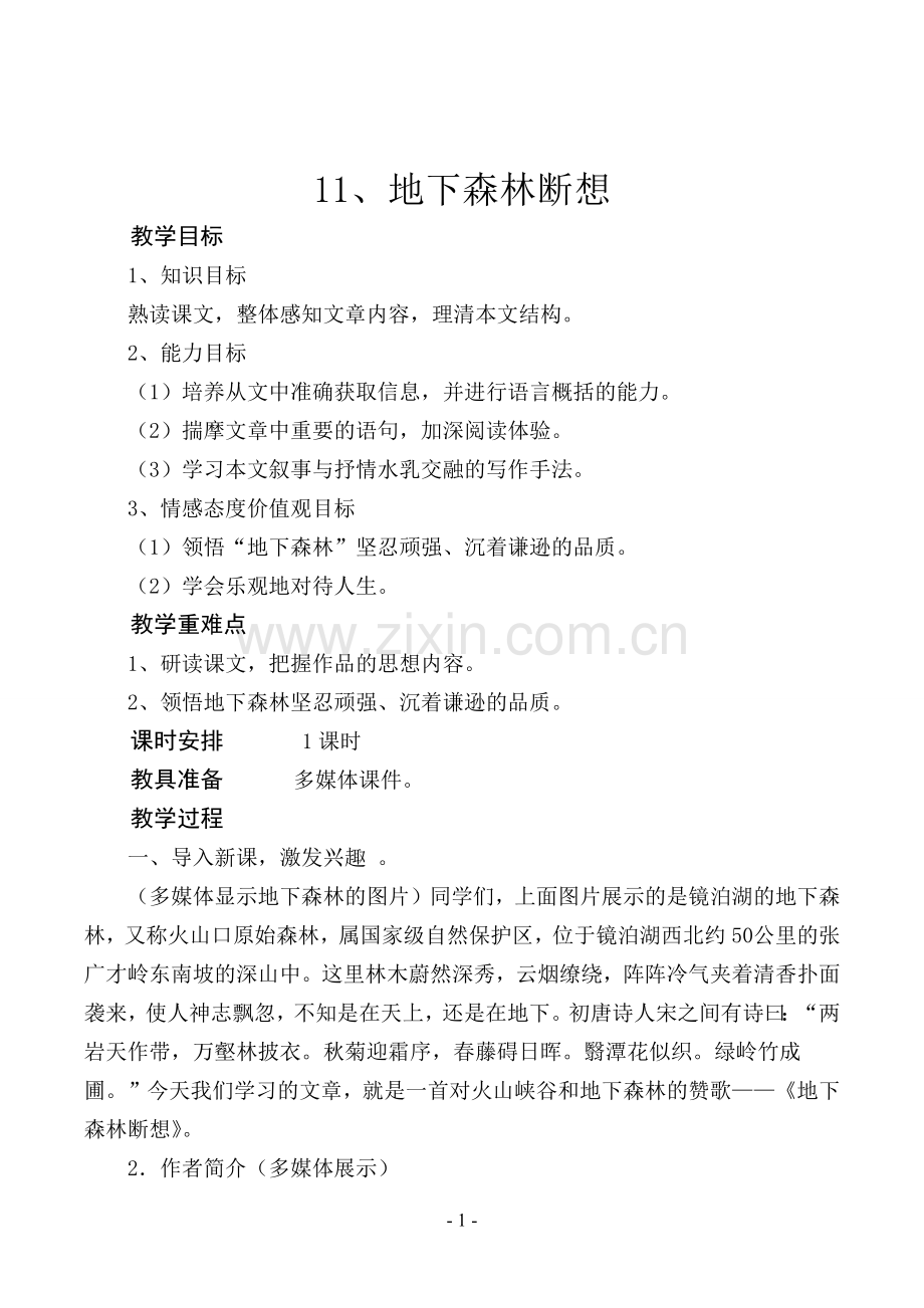 (多媒体显示地下森林的图片)同学们,上面图片展示的是镜泊湖的地下森林,又称火山口原始森林,属国家级自然保护区,位于镜泊湖西北约 50公里的张广才岭东南坡的深山中。这里林木蔚然深秀,云烟缭绕,阵阵冷气夹着清香扑面袭来,使人神志飘忽,不知是在天上,还是在地下。初唐诗人宋之间有诗曰:“两岩天作带,万壑林披衣。秋菊迎霜序,春藤碍日晖。翳潭花似织。绿岭竹成圃。”今天我们学习的文章,就是一首对火山峡谷和地下森林的赞歌——《地下森林断想》。