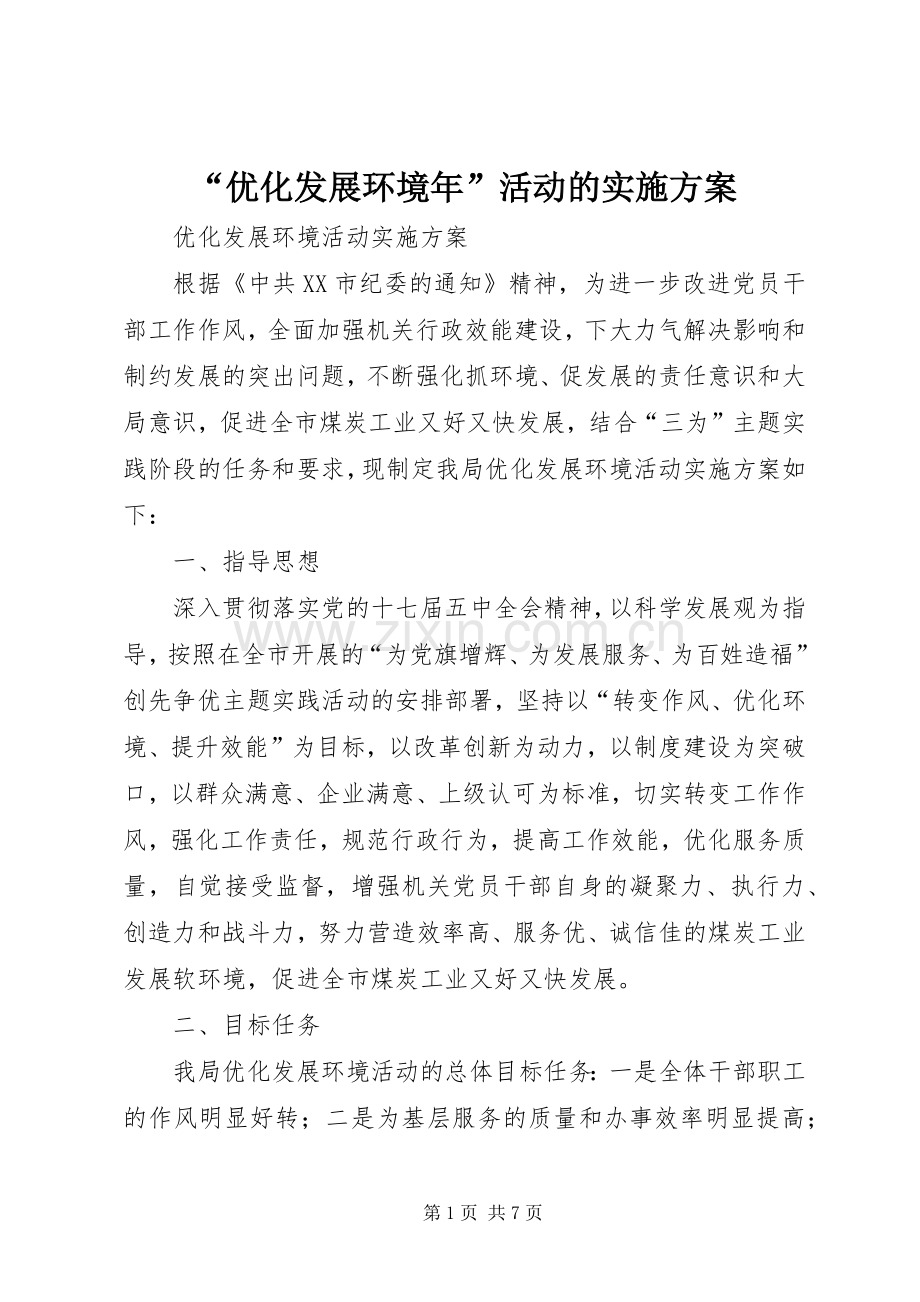 根据《中共XX市纪委的通知》精神,为进一步改进党员干部工作作风,全面加强机关行政效能建设,下大力气解决影响和制约发展的突出问题,不断强化抓环境、促发展的责任意识和大局意识,促进全市煤炭工业又好又快发展,结合“三为”主题实践阶段的任务和要求,现制定我局优化发展环境活动实施方案如下: