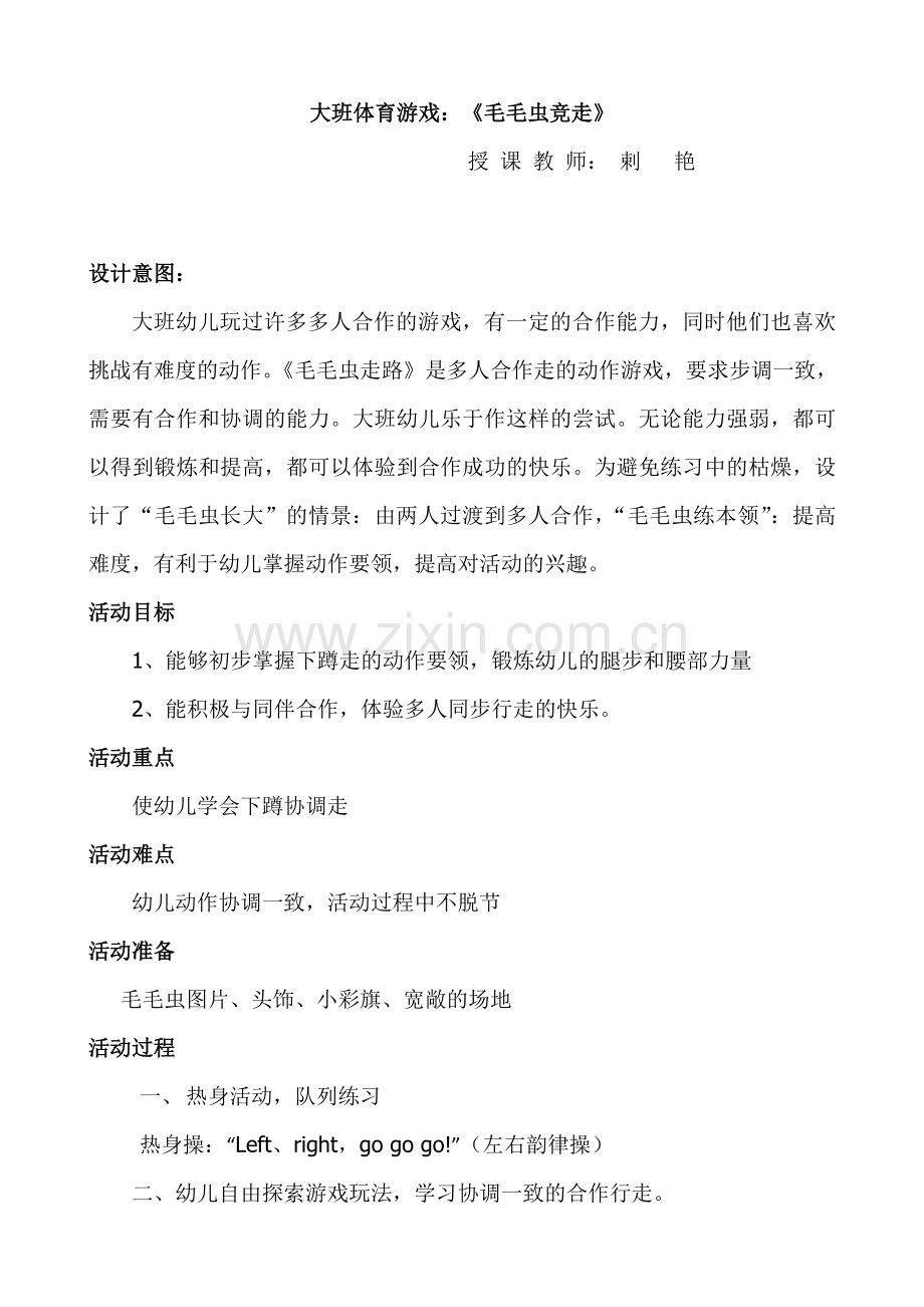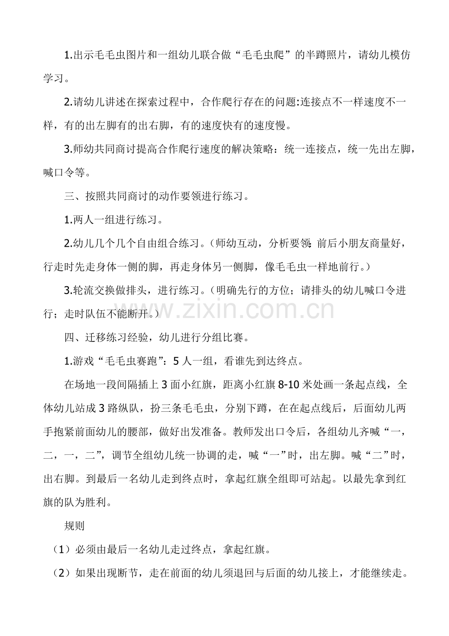 1.出示毛毛虫图片和一组幼儿联合做“毛毛虫爬”的半蹲照片,请幼儿模仿学习。