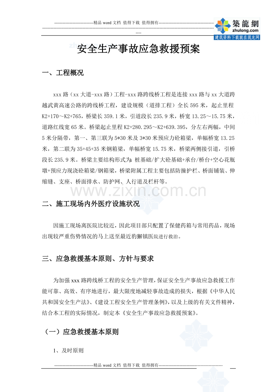 为加强xxx路跨线桥工程的安全生产管理,保证安全生产事故应急救援工作能可靠、高效、有序地进行,最大限度地减轻事故造成的损失,根据《中华人民共和国安全生产法》、《建设工程安全生产管理条例》,以及上级的有关文件精神,结合本工程的实际情况,制定本《安全生产事故应急救援预案》。