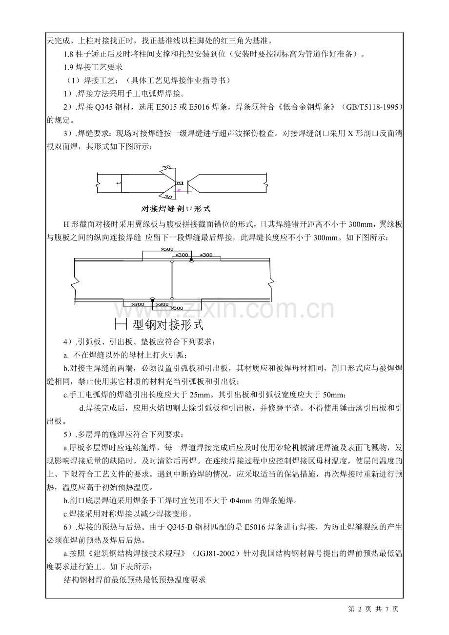 1.3柱子的地面拼装、焊接(如有需要时):柱子拼装时保证上、下柱轴线一致。焊接时须在柱翼缘板加引弧板和熄弧板。焊完背面第一道焊缝后必须进行碳弧气刨清根处理。焊接完毕,复核几何尺寸,再进行100%超声探伤,使其符合设计要求(一级焊缝)。引弧板和熄弧板在焊接完毕后必须切掉,并且将构件切割点处进行打磨。