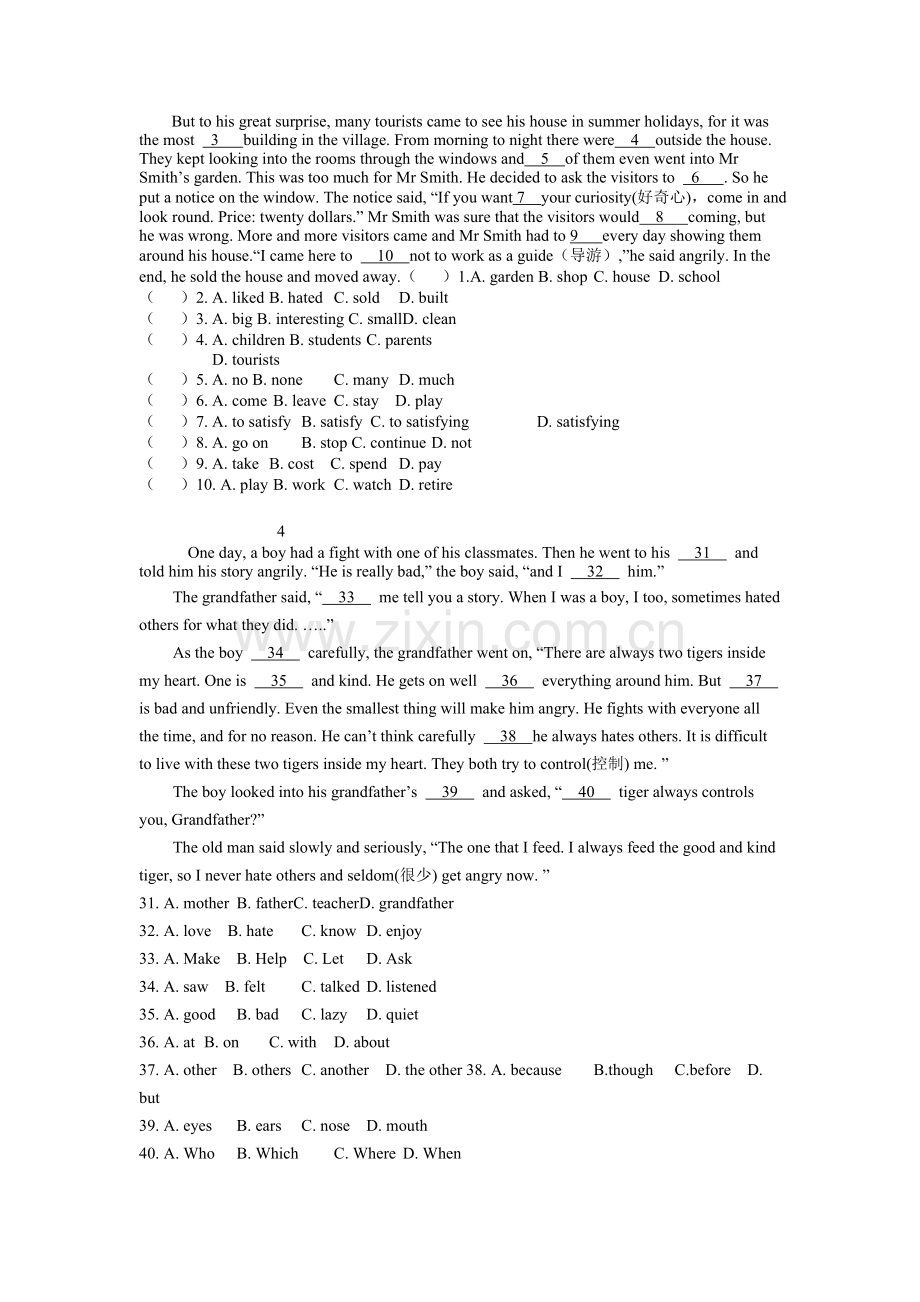 As the boy 34 carefully, the grandfather went on, “There are always two tigers inside my heart. One is 35 and kind. He gets on well 36 everything around him. But 37 is bad and unfriendly. Even the smallest thing will make him angry. He fights with everyone all the time, and for no reason. He can’t think carefully 38 he always hates others. It is difficult to live with these two tigers inside my heart. They both try to control(控制) me. ”