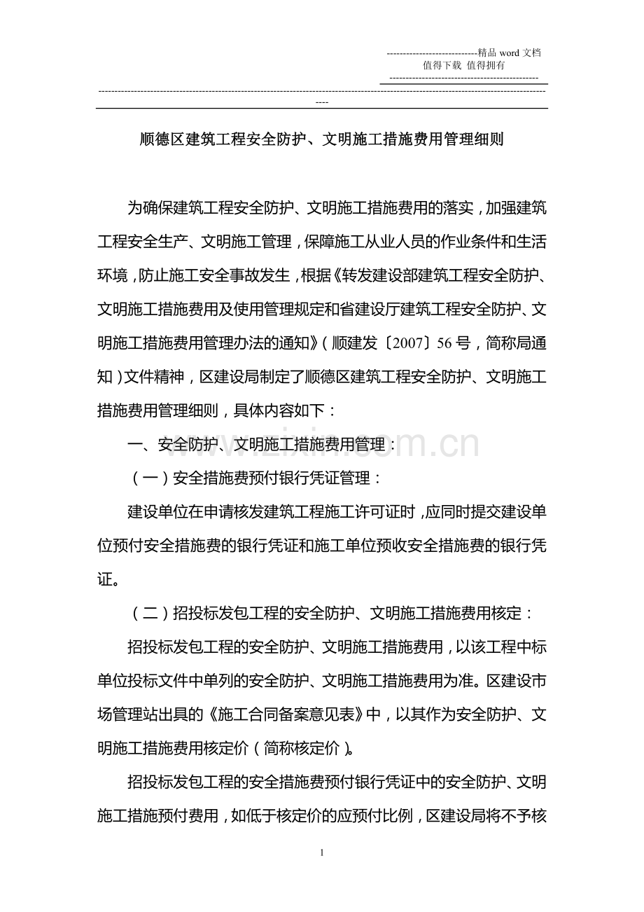 为确保建筑工程安全防护、文明施工措施费用的落实,加强建筑工程安全生产、文明施工管理,保障施工从业人员的作业条件和生活环境,防止施工安全事故发生,根据《转发建设部建筑工程安全防护、文明施工措施费用及使用管理规定和省建设厅建筑工程安全防护、文明施工措施费用管理办法的通知》(顺建发〔2007〕56号,简称局通知)文件精神,区建设局制定了顺德区建筑工程安全防护、文明施工措施费用管理细则,具体内容如下: