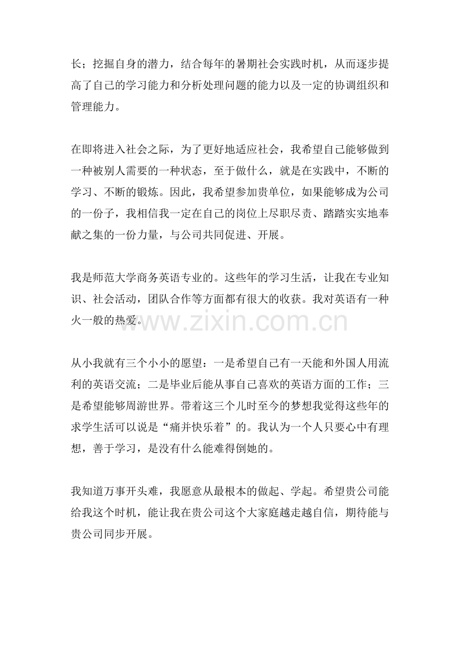 在即将进入社会之际,为了更好地适应社会,我希望自己能够做到一种被别人需要的一种状态,至于做什么,就是在实践中,不断的学习、不断的锻炼。因此,我希望参加贵单位,如果能够成为公司的一份子,我相信我一定在自己的岗位上尽职尽责、踏踏实实地奉献之集的一份力量,与公司共同促进、开展。