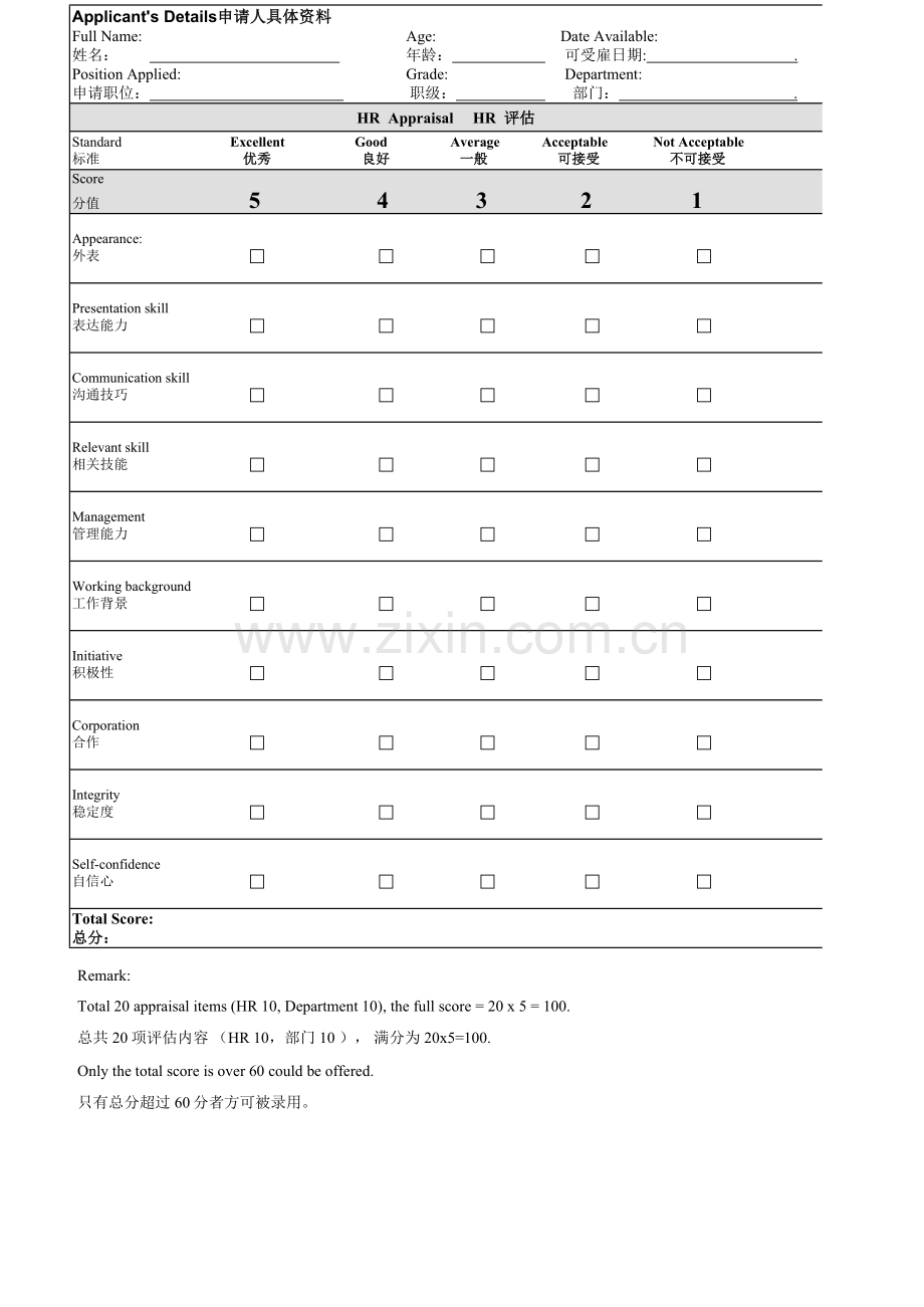 总共20项评估内容 (HR 10,部门 10 ), 满分为20x5=100.