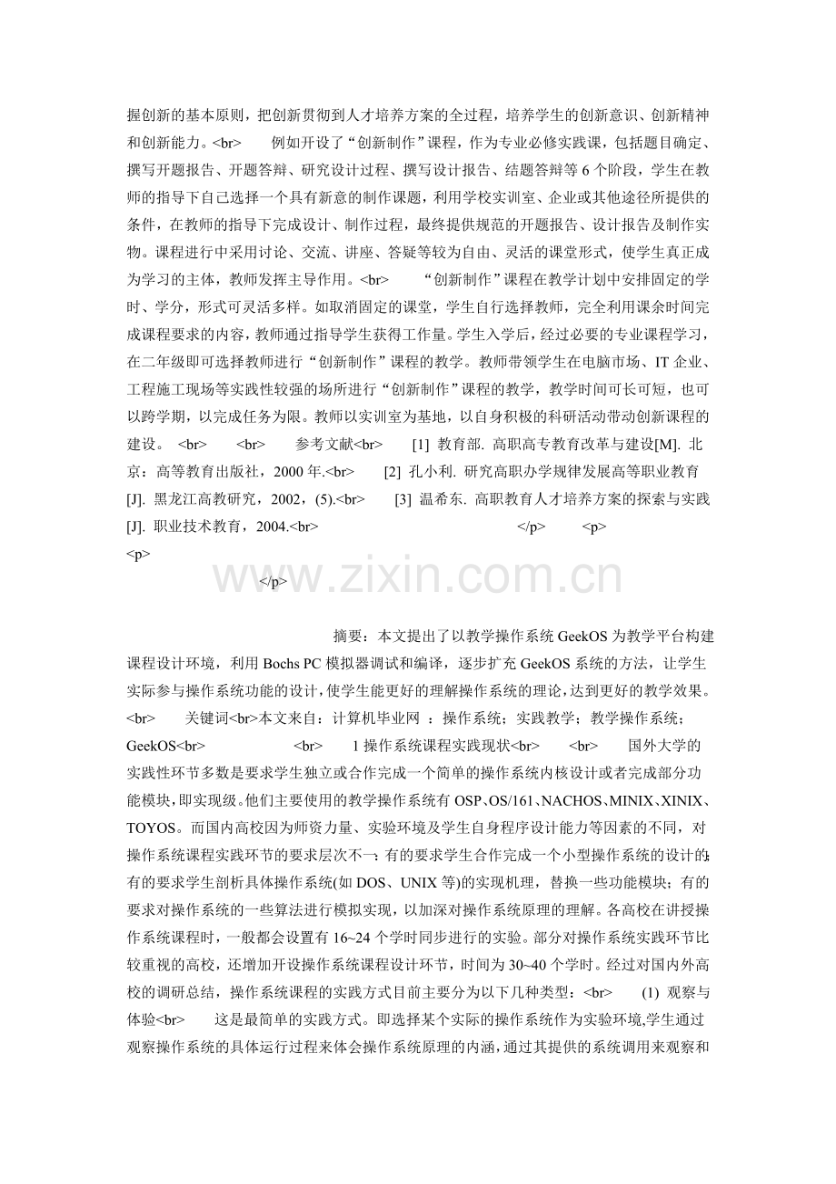 摘要:本文提出了以教学操作系统GeekOS为教学平台构建课程设计环境,利用Bochs PC模拟器调试和编译,逐步扩充GeekOS系统的方法,让学生实际参与操作系统功能的设计,使学生能更好的理解操作系统的理论,达到更好的教学效果。<br> 关键词<br>本文来自:计算机毕业网 :操作系统;实践教学;教学操作系统;GeekOS<br> <br> 1操作系统课程实践现状<br> <br> 国外大学的实践性环节多数是要求学生独立或合作完成一个简单的操作系统内核设计或者完成部分功能模块,即实现级。他们主要使用的教学操作系统有OSP、OS/161、NACHOS、MINIX、XINIX、TOYOS。而国内高校因为师资力量、实验环境及学生自身程序设计能力等因素的不同,对操作系统课程实践环节的要求层次不一:有的要求学生合作完成一个小型操作系统的设计的;有的要求学生剖析具体操作系统(如DOS、UNIX等)的实现机理,替换一些功能模块;有的要求对操作系统的一些算法进行模拟实现,以加深对操作系统原理的理解。各高校在讲授操作系统课程时,一般都会设置有16~24个学时同步进行的实验。部分对操作系统实践环节比较重视的高校,还增加开设操作系统课程设计环节,时间为30~40个学时。经过对国内外高校的调研总结,操作系统课程的实践方式目前主要分为以下几种类型:<br> (1) 观察与体验<br> 这是最简单的实践方式。即选择某个实际的操作系统作为实验环境,学生通过观察操作系统的具体运行过程来体会操作系统原理的内涵,通过其提供的系统调用来观察和验证操作系统中一些技术。这种方法不需要编写操作系统功能实现的代码,对真正理解操作系统内在功能的具体实现意义不大。<br> (2) 算法仿真<br> 这是一般院校最常见的实践方式。老师选取操作系统中的一些典型技术,如内存分配算法、生产者/消费者同步问题,让学生编写程序来模拟实现操作系统的功能。此种方式与程序设计课程的上机作业基本类似,有利于加深学生对操作系统理论和技术的理解,但达不到培养学生掌握操作系统的整体设计思想的目的。<br> (3) 替换功能模块<br> 这是较流行的实践方式。一般是以开放源代码的Linux为平台,让学生首先阅读系统代码,在理解部分操作系统功能的实现原理后,再要求学生用自己设计的功能模块替换其中相应的功能或为其扩展功能。浙江大学在这方面做得比较成功。但Linux是一个商业操作系统,系统庞大,结构复杂,对学校的师资和学生的能力要求都较高,一般院校实施的效果不是很好,也达不到培养学生掌握操作系统的整体设计思想的目的。<br> (4) 扩展设计操作系统<br> 这是对操作系统教学比较理想的实践方式。由任课教师提供一个只具有简单内核的教学操作系统的基本雏形,让学生对其功能进行完善和扩充。学生在一个虚拟或者真实的操作系统环境中进行动手实践,直接操作修改操作系统内核,从而达到掌握操作系统设计策略和技术方法的目的。当然也有学校要求学生独立设计一个结构相对简单但功能基本完备的小型操作系统。例如上海交通大学在操作系统实验中曾要求学生独立设计一个称为MOS的操作系统。由于与操作系统课程实验的教学目标相一致,这可能是最理想的实验方案。不过由于操作系统是一个大型的系统软件,其设计过于复杂,因此在实施起来有一定难度。<br> <br> 3GeekOS教学操作系统<br> <br> 教学实践证明,最好的“操作系统”课程实践平台并不是实用的商业操作系统,因为它过于庞大,设计复杂,短时间内难于掌握。而应该是一种与实际使用的操作系统比较接近,但规模又较小、易理解、便于调试的系统,即面向教学的操作系统。最重要的是系统要符合课程的需要――可留出一些作为学生作业的练习,帮助学生熟悉实际操作系统的结构和设计。<br> 美国马里兰大学教师最新开发的GeekOS,就是一个专门为满足操作系统课程教学要求设计的实践平台,它具有以下优点:<br> (1) GeekOS是一个基于通用x86架构的PC机上运行的微操作系统内核,作为一个GPL开源软件,任何人都可以在GPL下修改和免费使用, 由于其简单、实用、易懂,使得学生更易于理解操作系统的设计思想和实现过程。<br> (2) GeekOS是一个用C语言开发的操作系统,某种程度而言,GeekOS操作系统就是一个C语言程序,实践开发环境易于实现。学生可以在Linux或Unix环境下编程,对其进行功能扩充,也可以在Windows下使用Cygwin工具进行开发。<br> (3) 作为一个教学使用的操作系统,GeekOS围绕现代操作系统原理中的重要概念与方法,按照教学循序渐进的进度为学生设计了7个项目。这些项目由浅入深,对激发学生学习操作系统的兴趣和主动性,训练学生分析问题、解决问题的综合能力,起到了非常好的效果。<br> 在国内外的操作系统教学中,目前采用比较多的教学操作系统是NACHOS。和GeekOS相比,NACHOS只能运行在特定的MIPS机型的模拟器上,同时也存在一些其它缺点。首先,因为它的内核不是保存在模拟器的RAM中,这样,它不会受到内存容量的限制。这意味着内核数据结构的大小不是影响系统性能的重要因素,使得数据结构大小和空间容量的权衡不用考虑,这在一个实际操作系统设计中是不现实的。其次,NACHOS是与底层硬件相隔离的,所有机器模拟器和被模拟的硬件之间的接口由C++对象设计。这意味着学生不需要了解要访问的真正硬件是如何工作,而这些技术对于编写核心程序的程