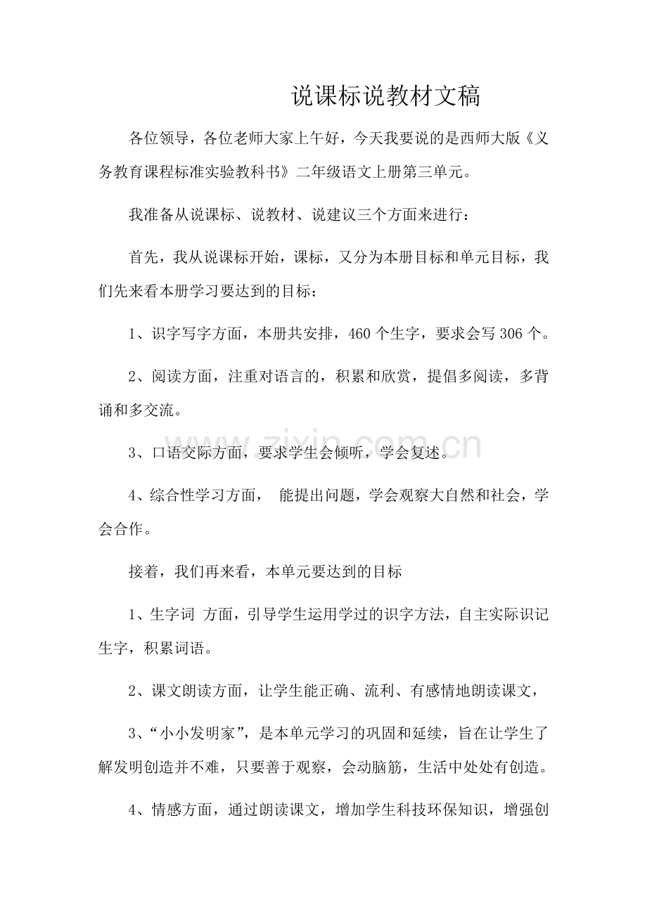 各位领导,各位老师大家上午好,今天我要说的是西师大版《义务教育课程标准实验教科书》二年级语文上册第三单元。