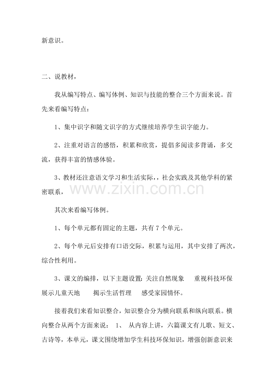 接着我们来看知识整合,知识整合分为横向联系和纵向联系。横向整合从两个方面来说: 1、 从内容上讲,六篇课文有儿歌、短文、古诗等,本单元,课文围绕增加学生科技环保知识,增强创新意识来进行。