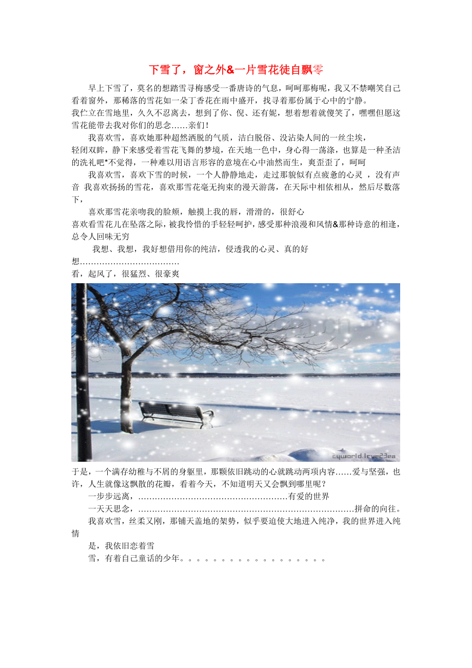 我喜欢雪,喜欢下雪的时候,一个人静静地走,走过那貌似有点疲惫的心灵 ,没有声音 我喜欢扬扬的雪花,喜欢那雪花毫无拘束的漫天游荡,在天际中相依相从,然后尽数落下,