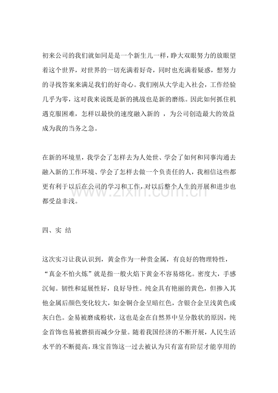 xx黄金珠宝首饰公司位于新 娱乐场1楼和1楼U的高额 区旁边。这里人流量较大,并且来往这里的人一般都具有一定的消费能力。本人在该公司任营业员一职,主要是向客人介绍简单的珠宝首饰知识,并最终促进成交。在这次实习过程中,本人对珠宝的一些简单知识有所掌握,学习了如何向客人销售珠宝首饰产品的一些技能,拓展了本人的知识面和视野。同时,作为一个被管理者,也学习到了一些管理的经验和方法,使理论知识得以实践和升华。