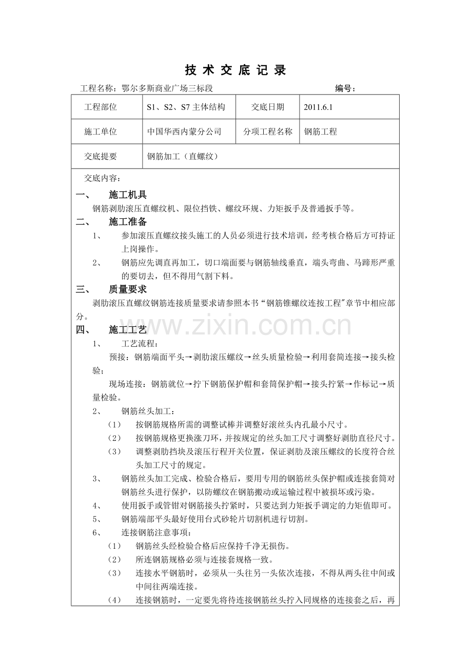 预接:钢筋端面平头→剥肋滚压螺纹→丝头质量检验→利用套简连接→接头检验;