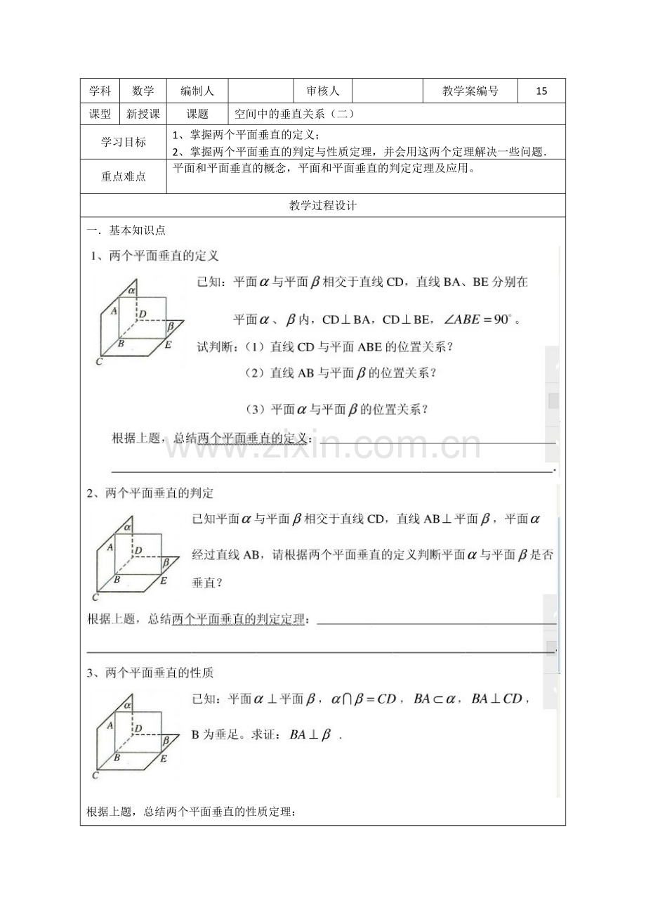 学科 数学 编制人 审核人 教学案编号 15 课型 新授课 课题 空间中的垂直关系(二) 学习目标 1、 掌握两个平面垂直的定义; 2、掌握两个平面垂直的判定与性质定理,并会用这两个定理解决一些问题. 重点难点 平面和平面垂直的概念,平面和平面垂直的判定定理及应用。 教学过程设计 一. 基本知识点 根据上题,总结两个平面垂直的性质定理: 二. 典例分析 课堂练习