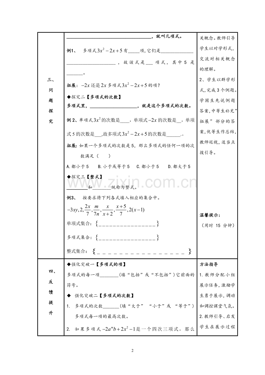 1、学生阅读教材,突破多项式的相关概念。教师引导学生以对学形式,交流对相关概念的理解。