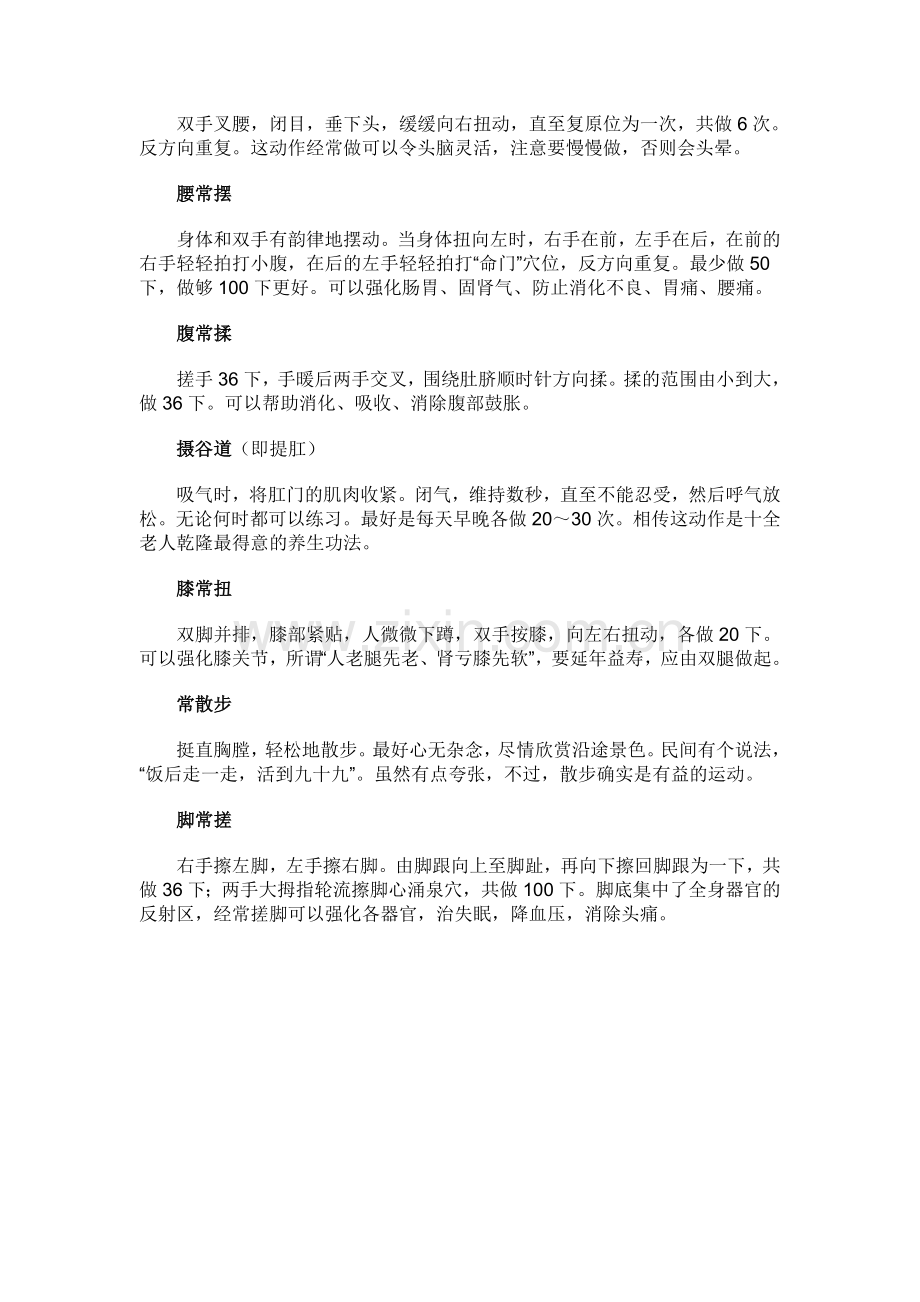 双脚并排,膝部紧贴,人微微下蹲,双手按膝,向左右扭动,各做20下。可以强化膝关节,所谓“人老腿先老、肾亏膝先软”,要延年益寿,应由双腿做起。