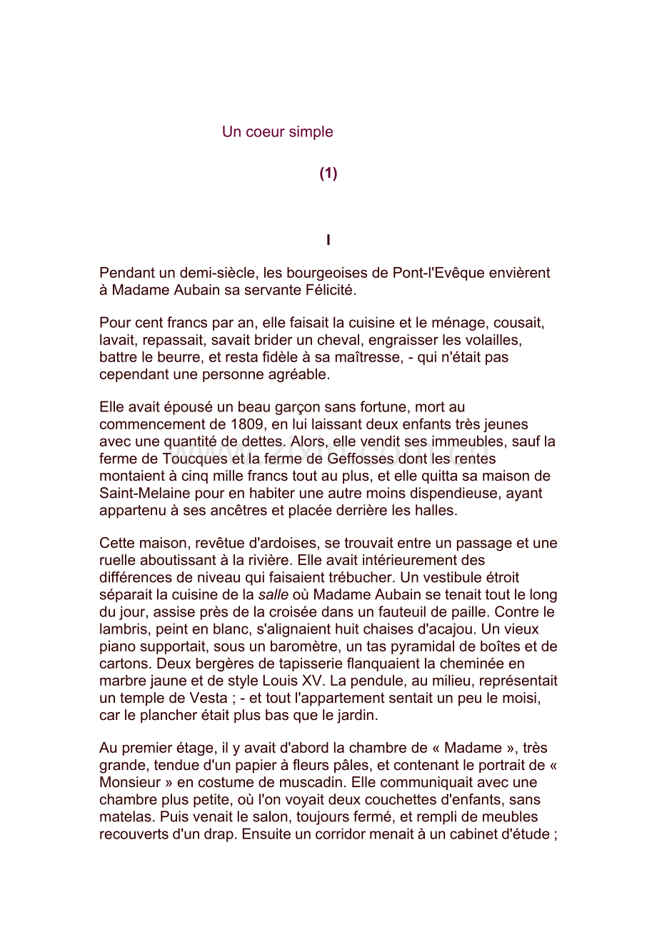 Au premier étage, il y avait d'abord la chambre de « Madame », très grande, tendue d'un papier à fleurs pâles, et contenant le portrait de « Monsieur » en costume de muscadin. Elle communiquait avec une chambre plus petite, où l'on voyait deux couchettes d'enfants, sans matelas. Puis venait le salon, toujours fermé, et rempli de meubles recouverts d'un drap. Ensuite un corridor menait à un cabinet d'étude ; des livres et des paperasses garnissaient les rayons d'une bibliothèque entourant de ses trois côtés un large bureau de bois noir. Les deux panneaux en retour disparaissaient sous des dessins à la plume, des paysages à la gouache et des gravures d'Audran, souvenirs d'un temps meilleur et d'un luxe évanoui. Une lucarne, au second étage, éclairait la chambre de Félicité, ayant vue sur les prairies.
