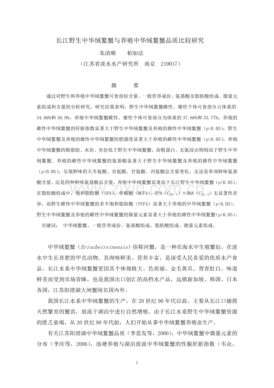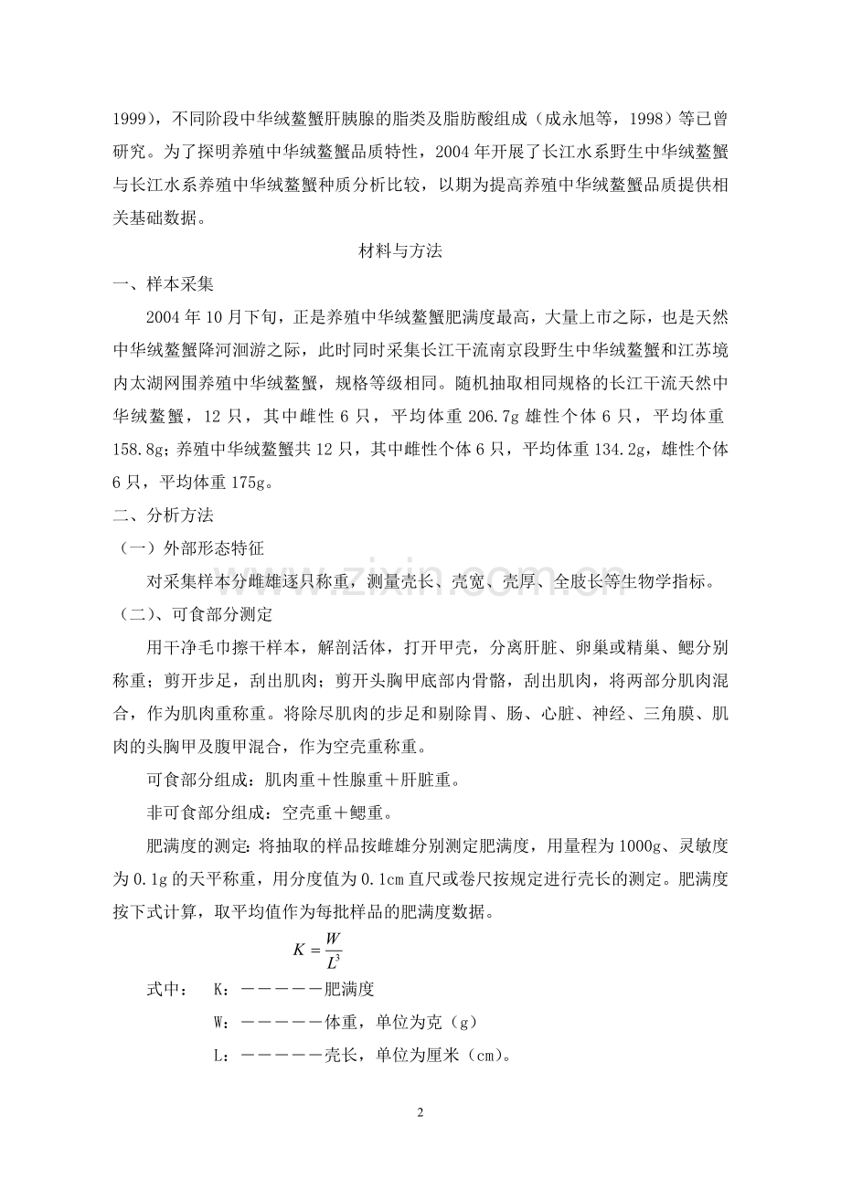 有关江苏阳澄湖中华绒鳌蟹品质(李思发等,2000),中华绒鳌蟹中微量元素的分布(李庆等,2006),池塘养殖与湖泊放流中华绒鳌蟹的性腺肝脏指数(韦众,1999),不同阶段中华绒鳌蟹肝胰腺的脂类及脂肪酸组成(成永旭等,1998)等已曾研究。为了探明养殖中华绒鳌蟹品质特性,2004年开展了长江水系野生中华绒鳌蟹与长江水系养殖中华绒鳌蟹种质分析比较,以期为提高养殖中华绒鳌蟹品质提供相关基础数据。