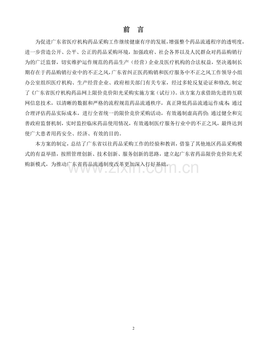 为促进广东省医疗机构药品采购工作继续健康有序的发展,增强整个药品流通程序的透明度,进一步营造公开、公平、公正的药品采购环境,加强政府、社会各界以及人民群众对药品购销行为的广泛监督,切实维护运作规范的药品生产(经营)企业及医疗机构的合法权益,坚决遏制长期存在于药品购销行业中的不正之风,广东省纠正医药购销和医疗服务中不正之风工作领导小组办公室组织医疗机构、生产经营企业、政府相关部门有关专家,经过多轮反复论证和修改,制定了《广东省医疗机构药品网上限价竞价阳光采购实施方案(试行)》。该方案力求借助先进的互联网信息技术,以清晰的数据和严格的流程规范药品流通秩序,真正降低药品流通运作成本;通过合理评估药品实际成本,进行全省统一的限价竞价采购活动,有效遏制虚高药价;通过健全和完善政府监督机制,实时监控临床药品使用情况,有效遏制医疗服务行业中的不正之风,最终达到使广大患者用药安全、经济、有效的目的。