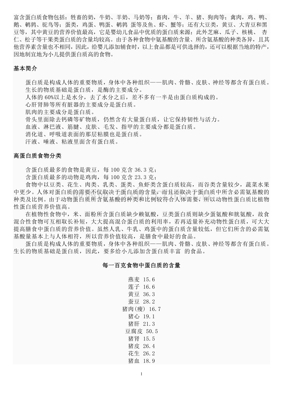 富含蛋白质食物包括:牲畜的奶,牛奶、羊奶、马奶等;畜肉,牛、羊、猪、狗肉等;禽肉,鸡、鸭、鹅、鹌鹑、驼鸟等;蛋类,鸡蛋、鸭蛋、鹌鹑 蛋等及鱼、虾、蟹等;还有大豆类,黄豆、大青豆和黑豆等,其中黄豆的营养价值最高,它是婴幼儿食品中优质的蛋白质来源;此外芝麻、瓜子、核桃、 杏仁、松子等干果类蛋白质的含量均较高。由于各种食物中氨基酸的含量、所含氨基酸的种类各异,且其他营养素含量也不相同,因此,给婴儿添加辅食时,以上食品都是可供选择的,还可以根据当地的特产,因地制宜地为小儿提供蛋白质高的食物。