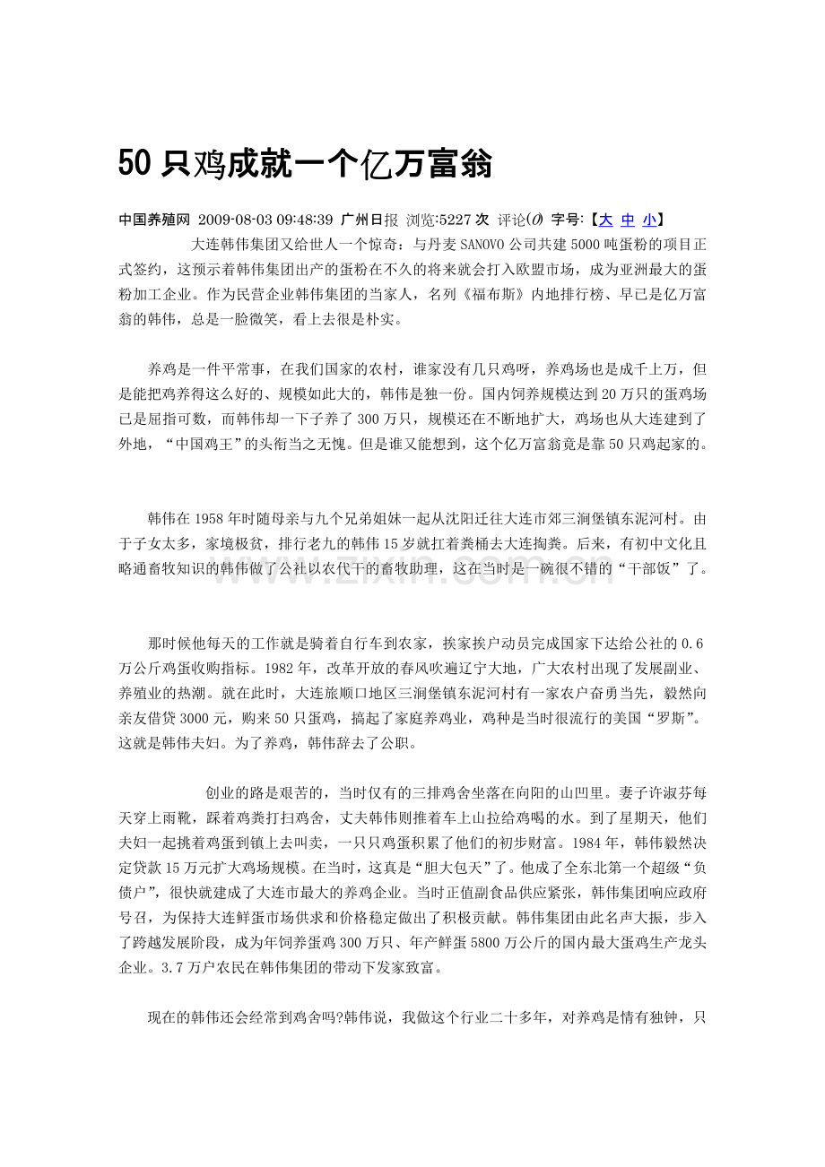 养鸡是一件平常事,在我们国家的农村,谁家没有几只鸡呀,养鸡场也是成千上万,但是能把鸡养得这么好的、规模如此大的,韩伟是独一份。国内饲养规模达到20万只的蛋鸡场已是屈指可数,而韩伟却一下子养了300万只,规模还在不断地扩大,鸡场也从大连建到了外地,“中国鸡王”的头衔当之无愧。但是谁又能想到,这个亿万富翁竟是靠50只鸡起家的。