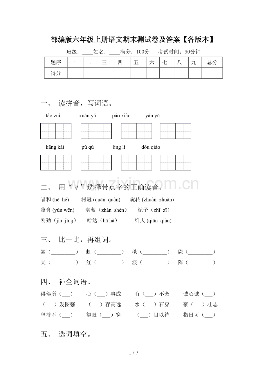 部编版六年级上册语文期末测试卷及答案【各版本】