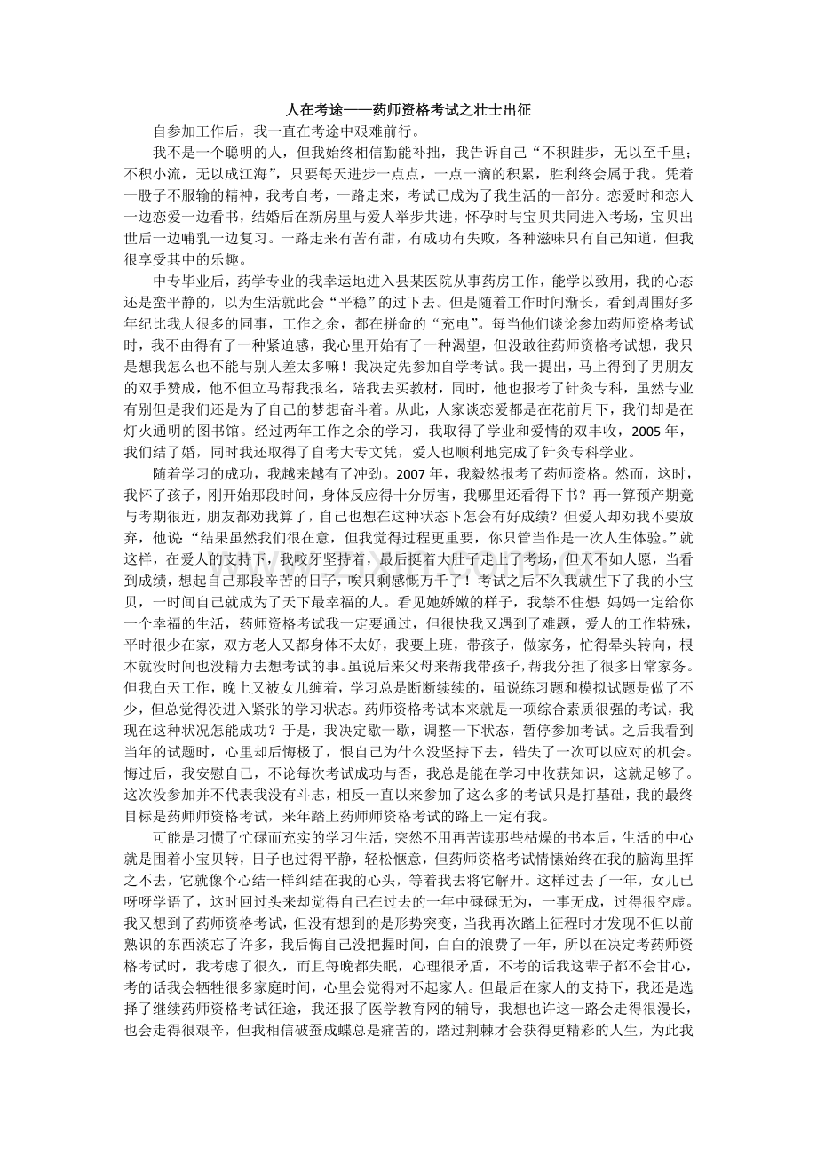 随着学习的成功,我越来越有了冲劲。2007年,我毅然报考了药师资格。然而,这时,我怀了孩子,刚开始那段时间,身体反应得十分厉害,我哪里还看得下书?再一算预产期竟与考期很近,朋友都劝我算了,自己也想在这种状态下怎会有好成绩?但爱人却劝我不要放弃,他说:“结果虽然我们很在意,但我觉得过程更重要,你只管当作是一次人生体验。”就这样,在爱人的支持下,我咬牙坚持着,最后挺着大肚子走上了考场,但天不如人愿,当看到成绩,想起自己那段辛苦的日子,唉只剩感慨万千了!考试之后不久我就生下了我的小宝贝,一时间自己就成为了天下最幸福的人。看见她娇嫩的样子,我禁不住想:妈妈一定给你一个幸福的生活,药师资格考试我一定要通过,但很快我又遇到了难题,爱人的工作特殊,平时很少在家,双方老人又都身体不太好,我要上班,带孩子,做家务,忙得晕头转向,根本就没时间也没精力去想考试的事。虽说后来父母来帮我带孩子,帮我分担了很多日常家务。但我白天工作,晚上又被女儿缠着,学习总是断断续续的,虽说练习题和模拟试题是做了不少,但总觉得没进入紧张的学习状态。药师资格考试本来就是一项综合素质很强的考试,我现在这种状况怎能成功?于是,我决定歇一歇,调整一下状态,暂停参加考试。之后我看到当年的试题时,心里却后悔极了,恨自己为什么没坚持下去,错失了一次可以应对的机会。悔过后,我安慰自已,不论每次考试成功与否,我总是能在学习中收获知识,这就足够了。这次没参加并不代表我没有斗志,相反一直以来参加了这么多的考试只是打基础,我的最终目标是药师师资格考试,来年踏上药师师资格考试的路上一定有我。