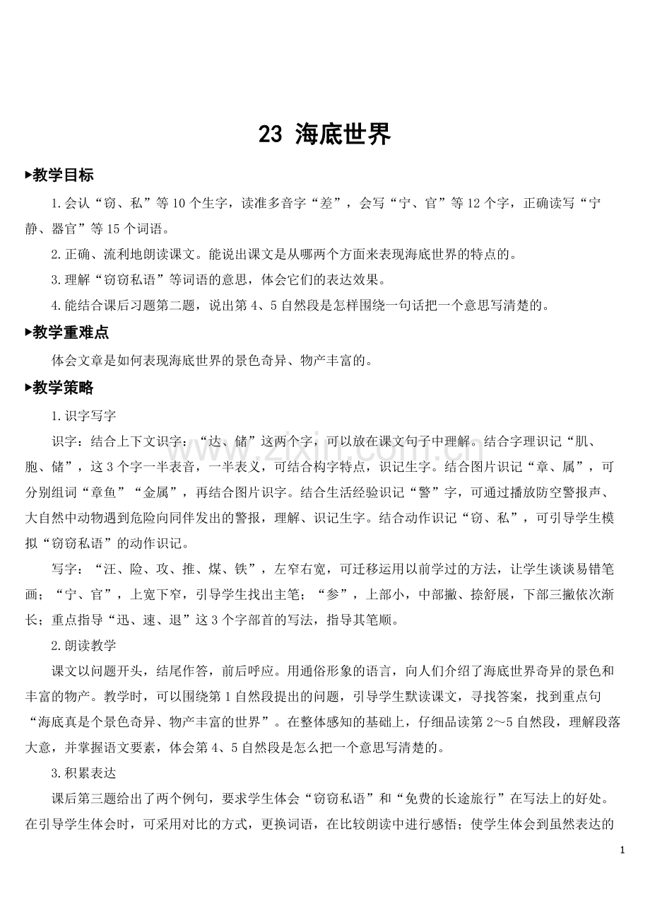 课文以问题开头,结尾作答,前后呼应。用通俗形象的语言,向人们介绍了海底世界奇异的景色和丰富的物产。教学时,可以围绕第1自然段提出的问题,引导学生默读课文,寻找答案,找到重点句“海底真是个景色奇异、物产丰富的世界”。在整体感知的基础上,仔细品读第2~5自然段,理解段落大意,并掌握语文要素,体会第4、5自然段是怎么把一个意思写清楚的。