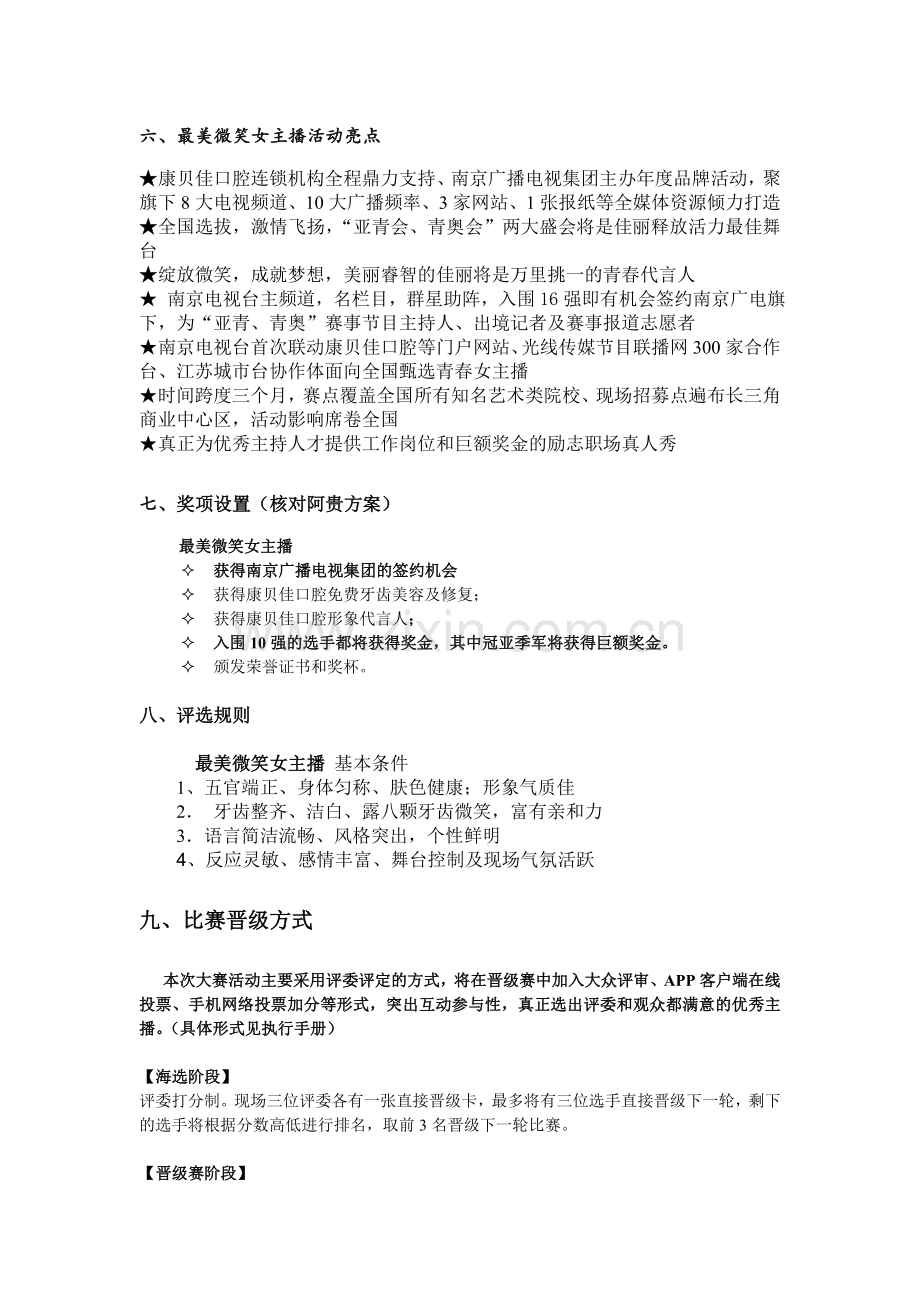 五、大赛流程:全国海选——32强晋级赛——16强决赛战——完美蜕变(16强微笑训练营)——12强争夺战(魅力金陵十二钗)——完美蜕变(12强微笑训练营)——总决赛(魅力绽放耀双青)