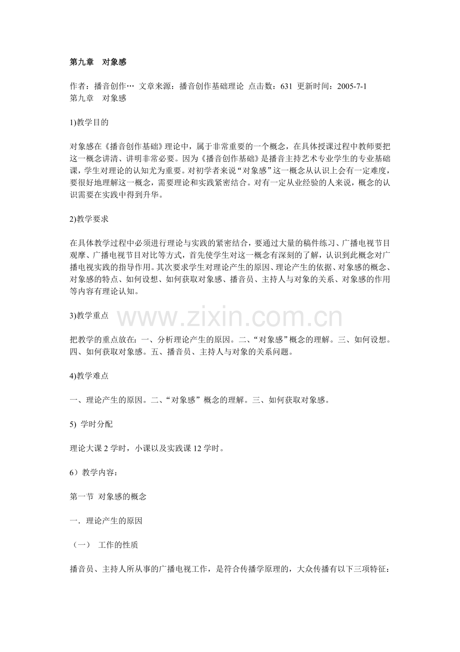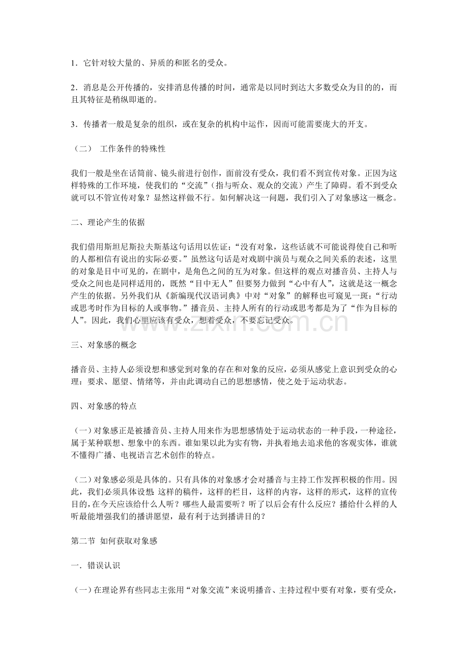 (一)对象感正是被播音员、主持人用来作为思想感情处于运动状态的一种手段,一种途径,属于某种联想、想象中的东西。谁如果以此为实有物,并执着地去追求他的客观实体,谁就不懂得广播、电视语言艺术创作的特点。