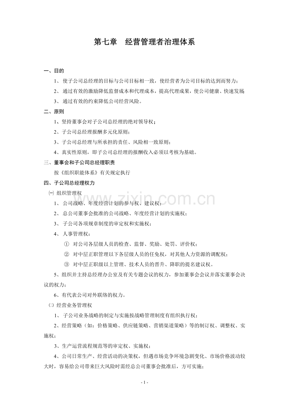 1、任期:子公司总经理任期每3年一届,任期内连续2年未能完成公司主要经营指标者做降低下一年度年薪或免职处理;业绩优秀者可连任,业绩欠佳者不得连任;