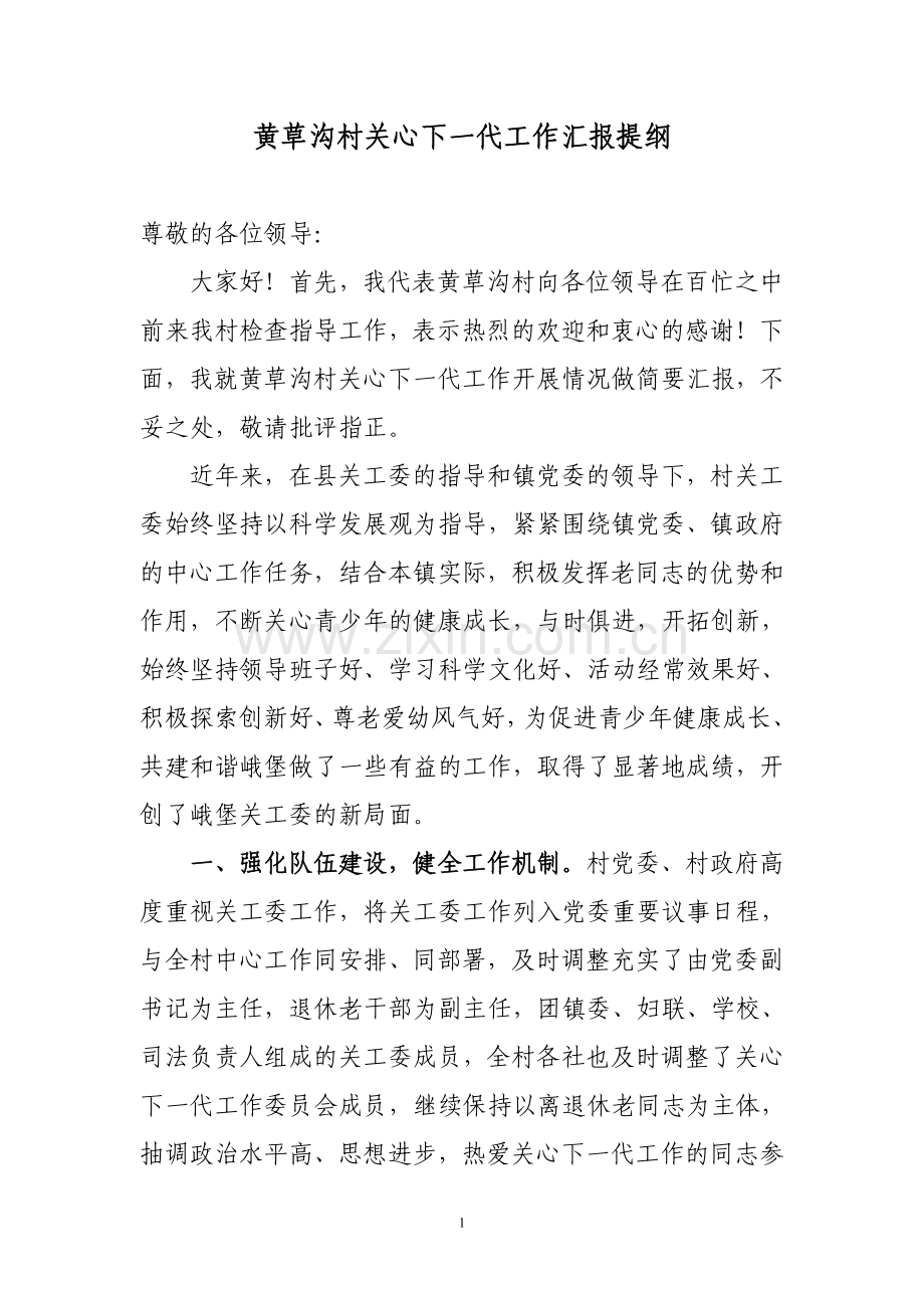 大家好!首先,我代表黄草沟村向各位领导在百忙之中前来我村检查指导工作,表示热烈的欢迎和衷心的感谢!下面,我就黄草沟村关心下一代工作开展情况做简要汇报,不妥之处,敬请批评指正。